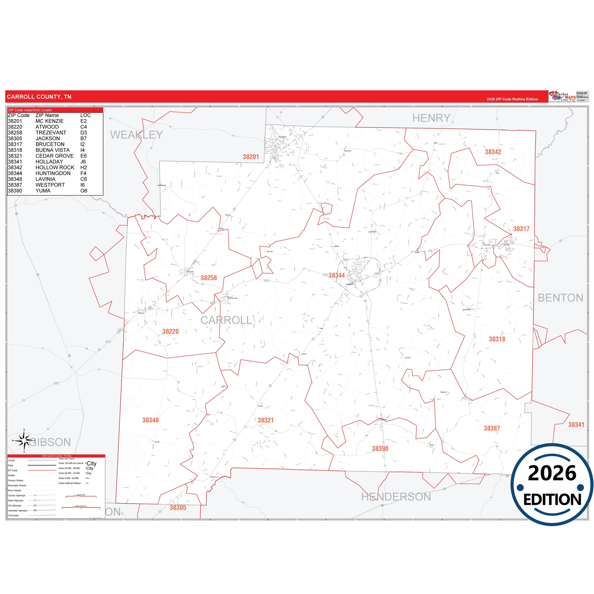 The RedLine Style map of Carroll County, TN shows ZIP code areas overlaid on a detailed road network of Carroll County, Tennessee. Ideal for drawing locations, territories, and other applications. Base map features include all major streets and highways labeled, cities and towns, county and state boundaries, neighborhood names, railroads, and a clean white background suitable for marking and planning.