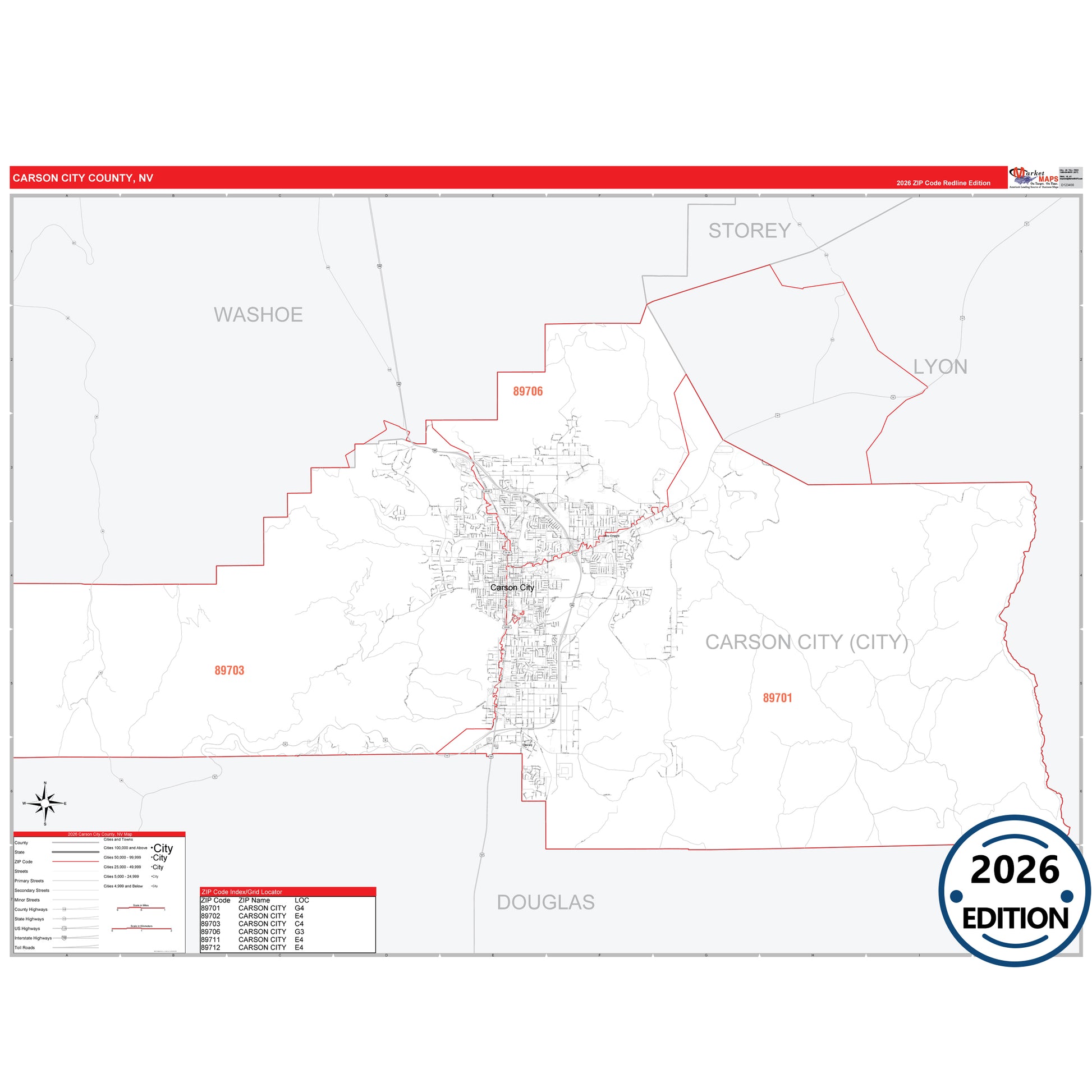 The RedLine Style map of Carson City County, NV shows ZIP code areas overlaid on a detailed road network of Carson City County, Nevada. Ideal for drawing locations, territories, and other applications. Base map features include all major streets and highways labeled, cities and towns, county and state boundaries, neighborhood names, railroads, and a clean white background suitable for marking and planning.