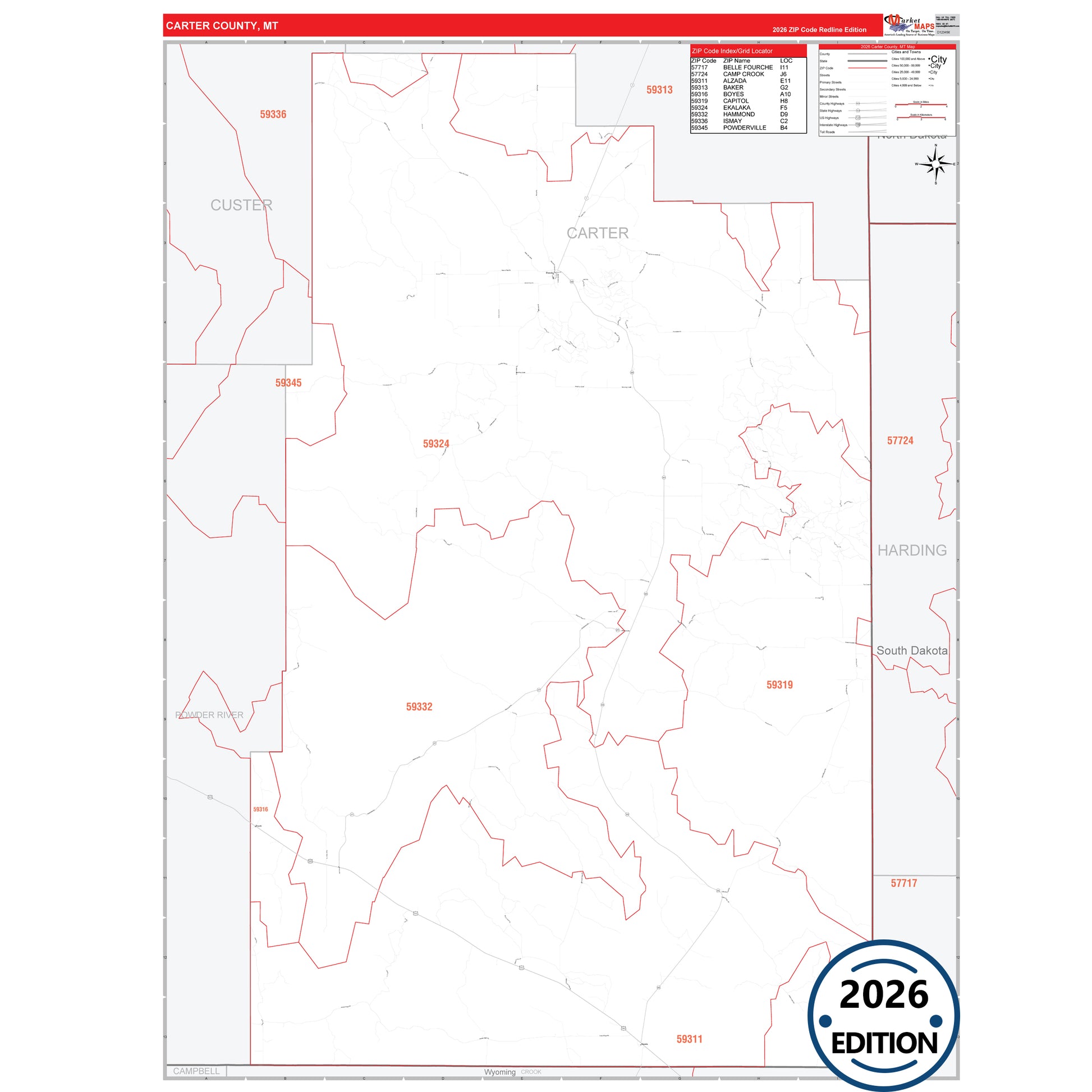 The RedLine Style map of Carter County, MT shows ZIP code areas overlaid on a detailed road network of Carter County, Montana. Ideal for drawing locations, territories, and other applications. Base map features include all major streets and highways labeled, cities and towns, county and state boundaries, neighborhood names, railroads, and a clean white background suitable for marking and planning.