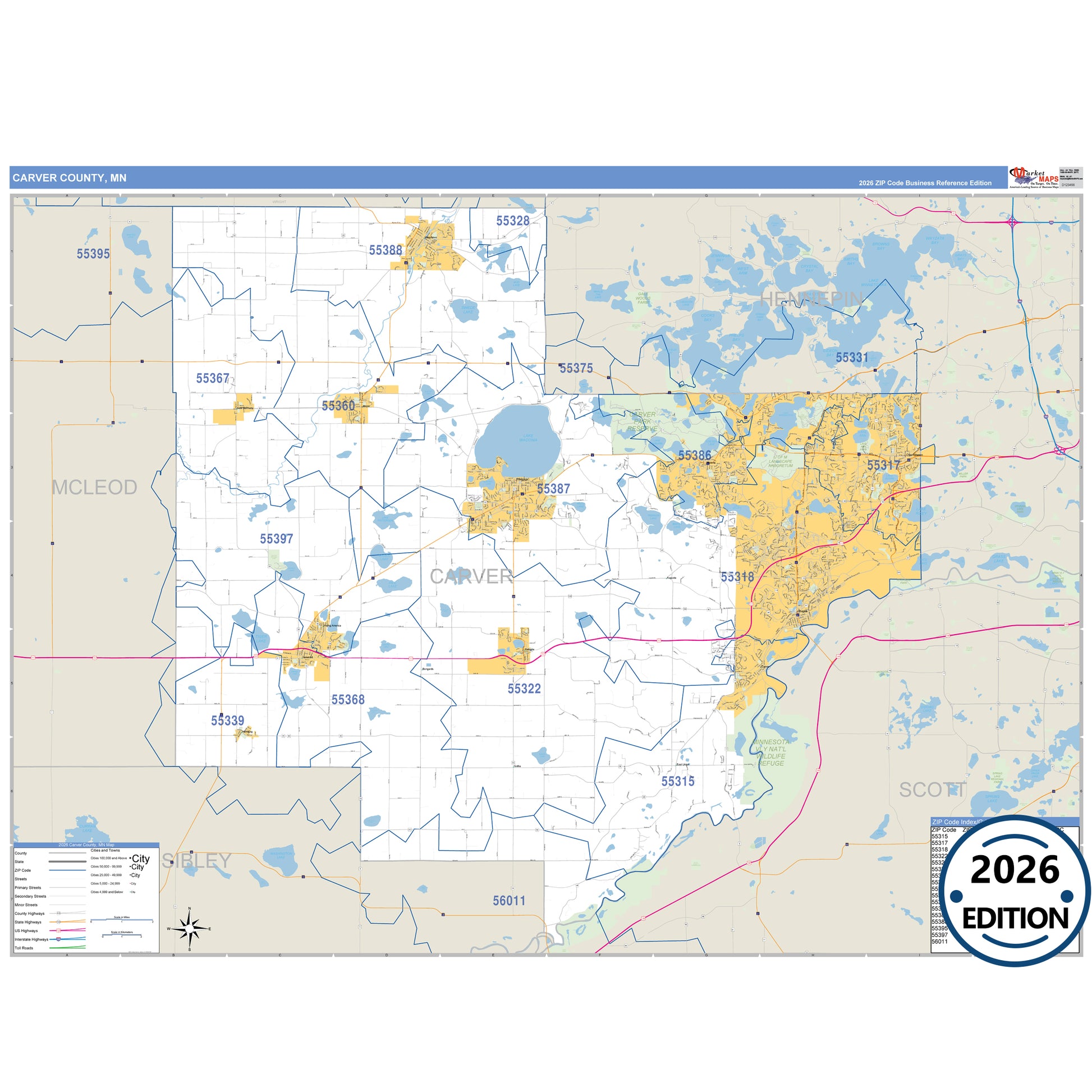The Business Reference Style Carver County, MN is a detailed map that includes all towns, cities, major roadways, and highways. Available in multiple wall map sizes, perfect for home, school, office, or business display.