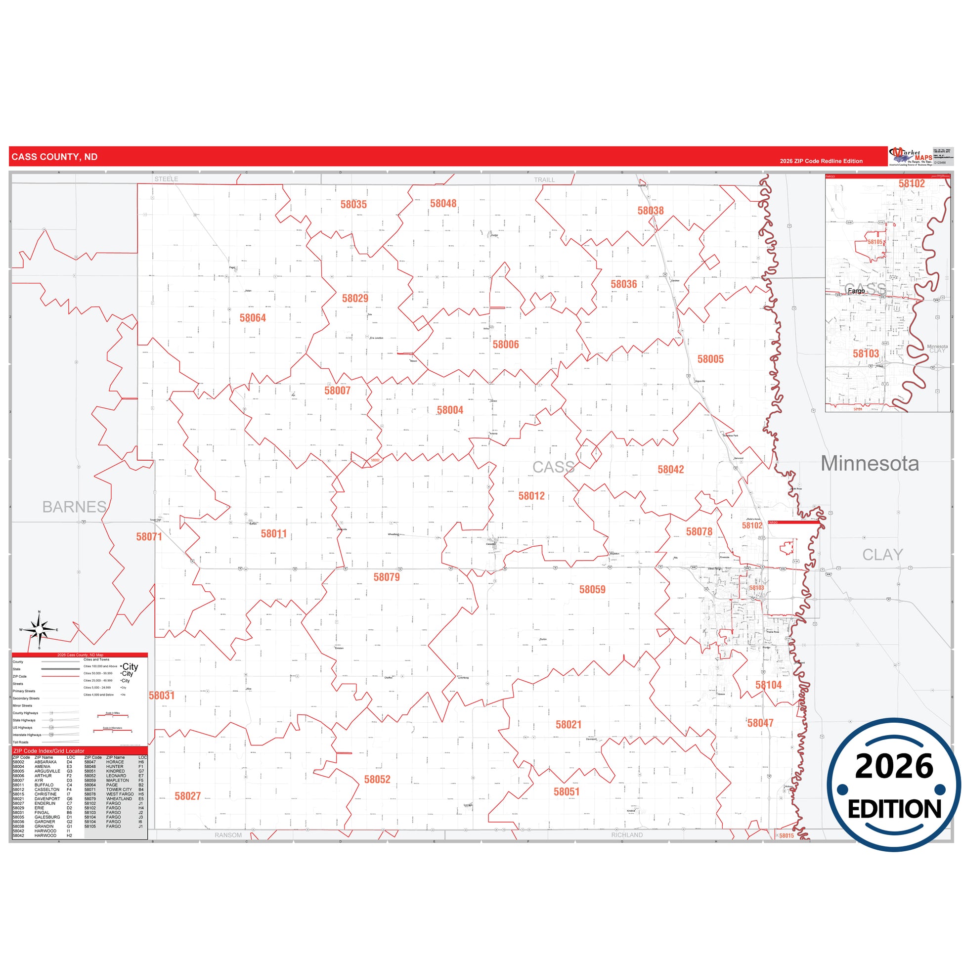 The RedLine Style map of Cass County, ND shows ZIP code areas overlaid on a detailed road network of Cass County, North Dakota. Ideal for drawing locations, territories, and other applications. Base map features include all major streets and highways labeled, cities and towns, county and state boundaries, neighborhood names, railroads, and a clean white background suitable for marking and planning.