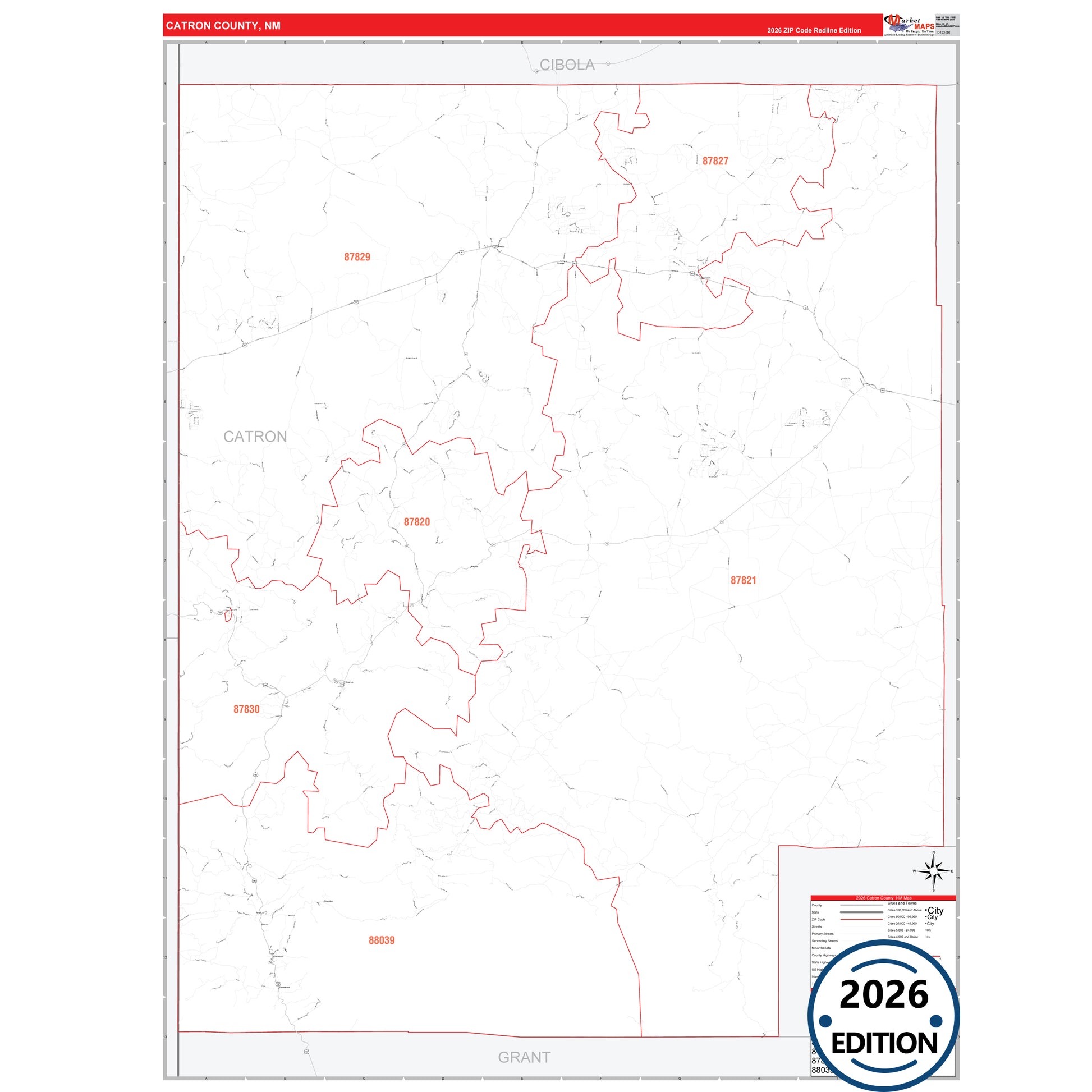 The RedLine Style map of Catron County, NM shows ZIP code areas overlaid on a detailed road network of Catron County, New Mexico. Ideal for drawing locations, territories, and other applications. Base map features include all major streets and highways labeled, cities and towns, county and state boundaries, neighborhood names, railroads, and a clean white background suitable for marking and planning.