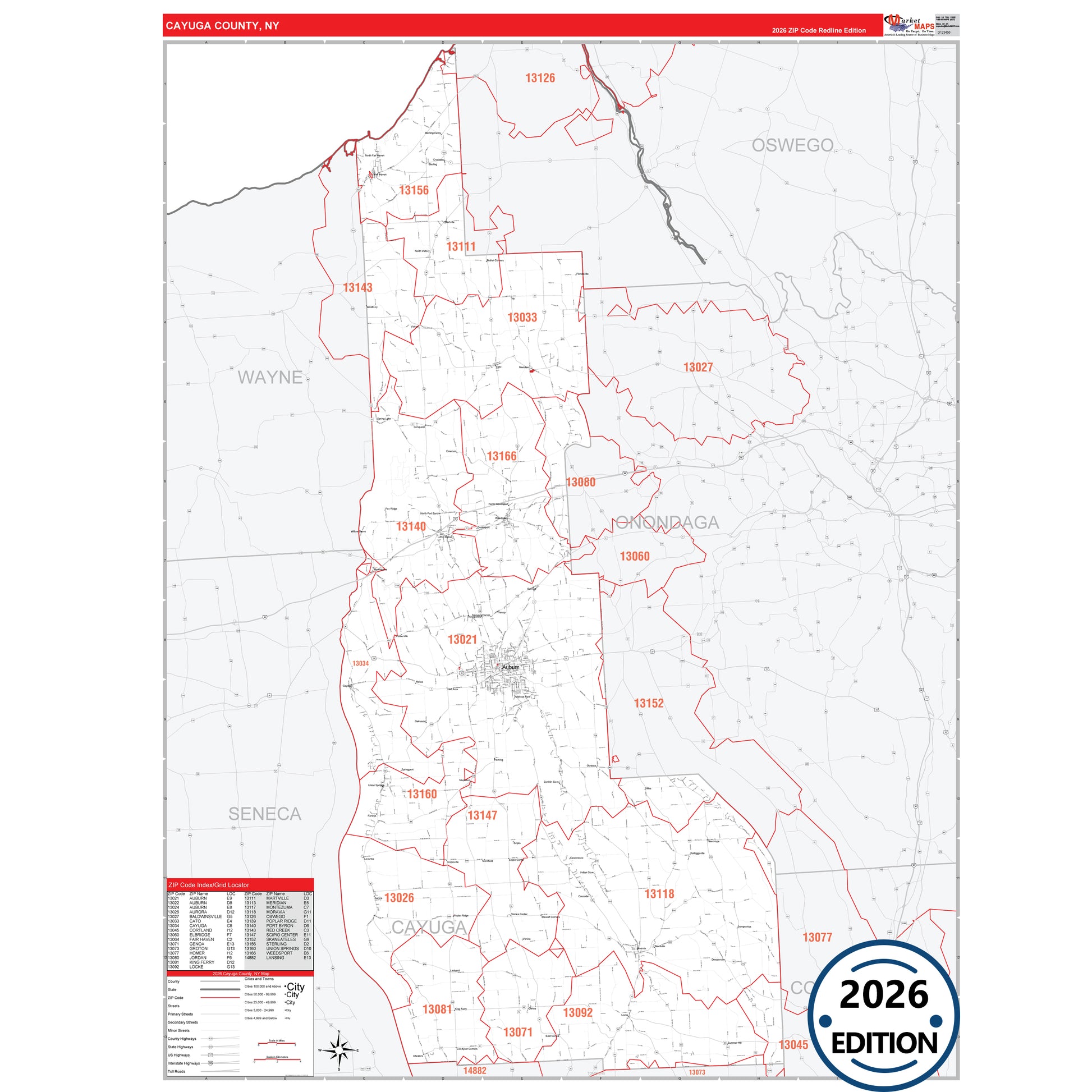 The RedLine Style map of Cayuga County, NY shows ZIP code areas overlaid on a detailed road network of Cayuga County, New York. Ideal for drawing locations, territories, and other applications. Base map features include all major streets and highways labeled, cities and towns, county and state boundaries, neighborhood names, railroads, and a clean white background suitable for marking and planning.