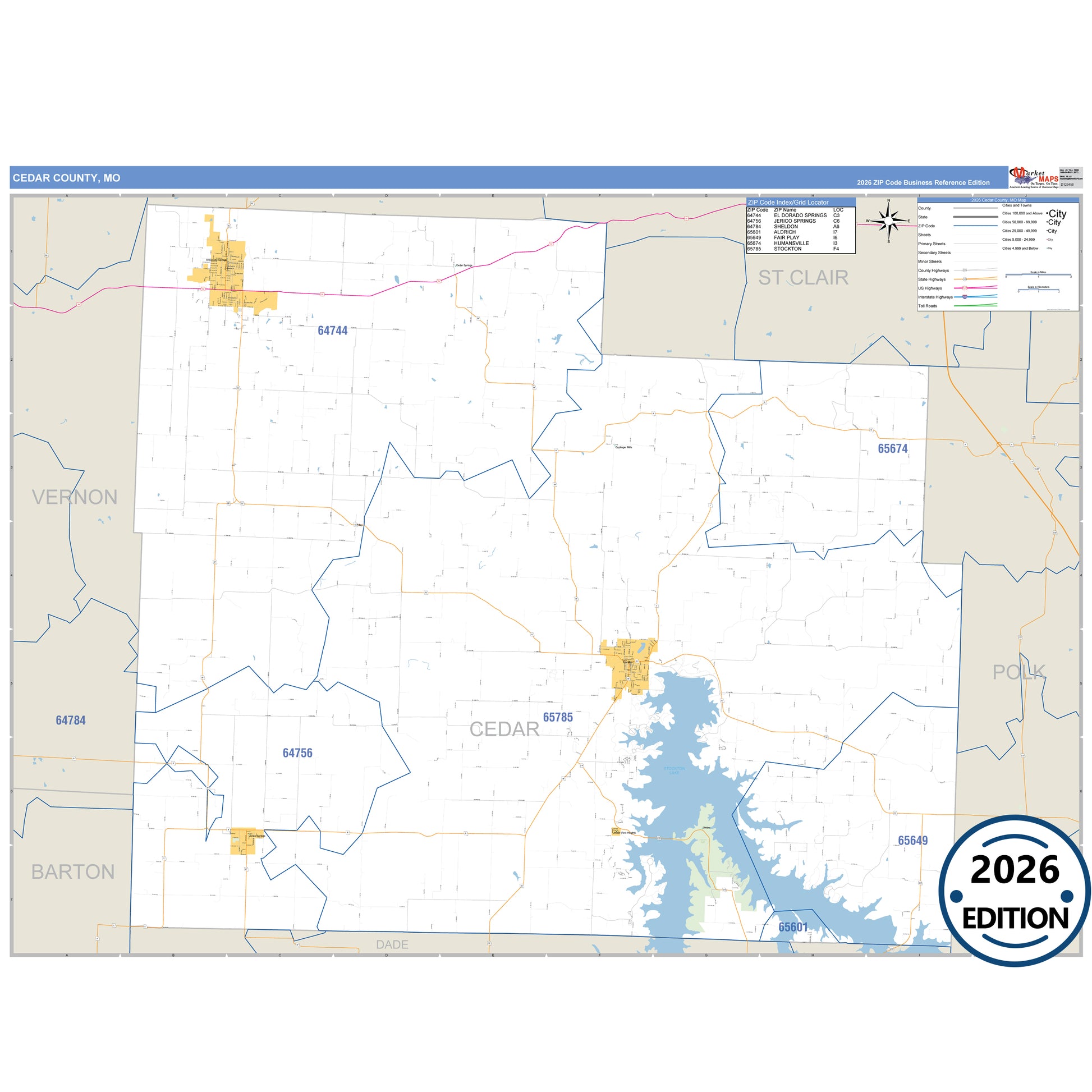 The Business Reference Style Cedar County, MO is a detailed map that includes all towns, cities, major roadways, and highways. Available in multiple wall map sizes, perfect for home, school, office, or business display.