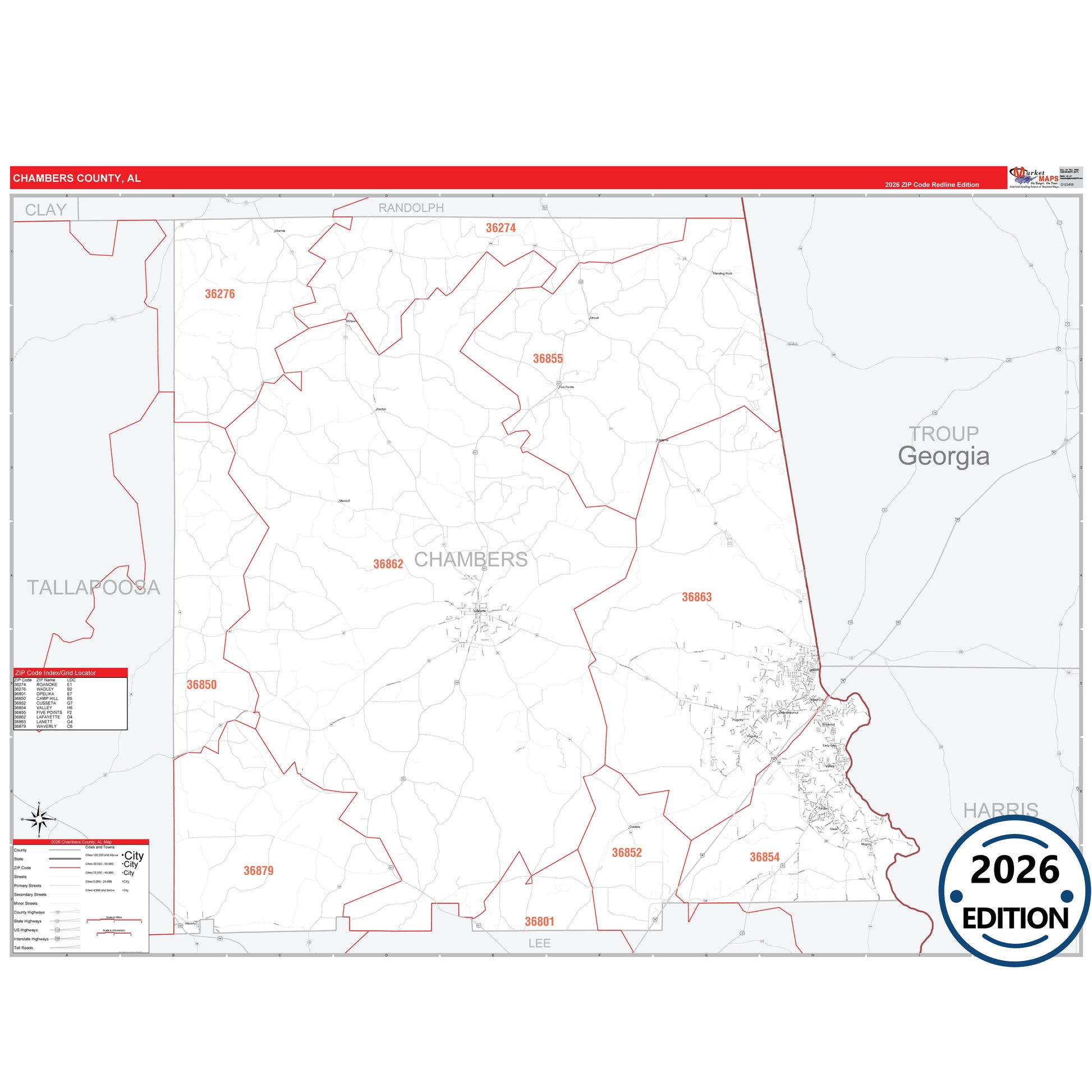 The RedLine Style map of Chambers County, AL shows ZIP code areas overlaid on a detailed road network of Chambers County, Alabama. Ideal for drawing locations, territories, and other applications. Base map features include all major streets and highways labeled, cities and towns, county and state boundaries, neighborhood names, railroads, and a clean white background suitable for marking and planning.