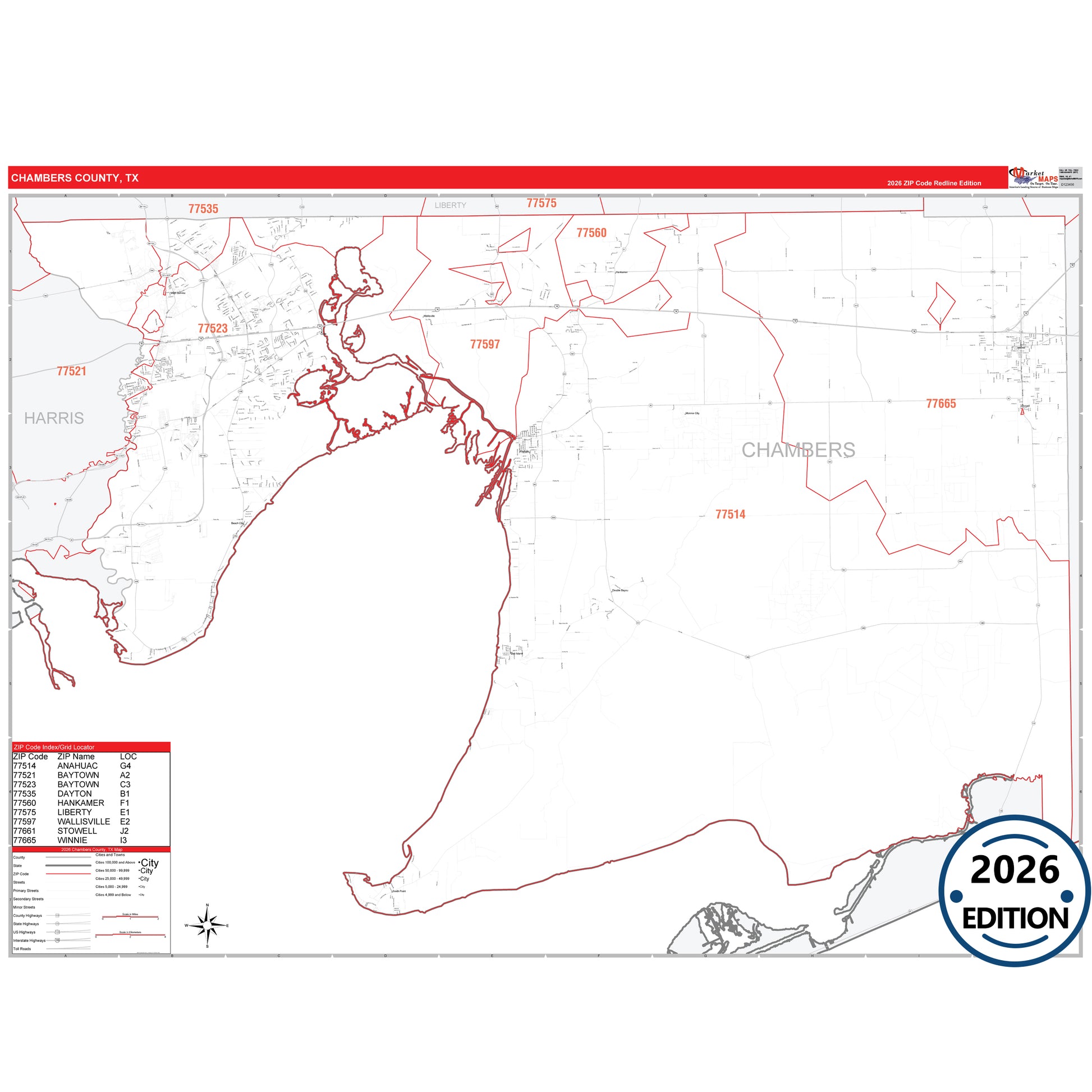 The RedLine Style map of Chambers County, TX shows ZIP code areas overlaid on a detailed road network of Chambers County, Texas. Ideal for drawing locations, territories, and other applications. Base map features include all major streets and highways labeled, cities and towns, county and state boundaries, neighborhood names, railroads, and a clean white background suitable for marking and planning.