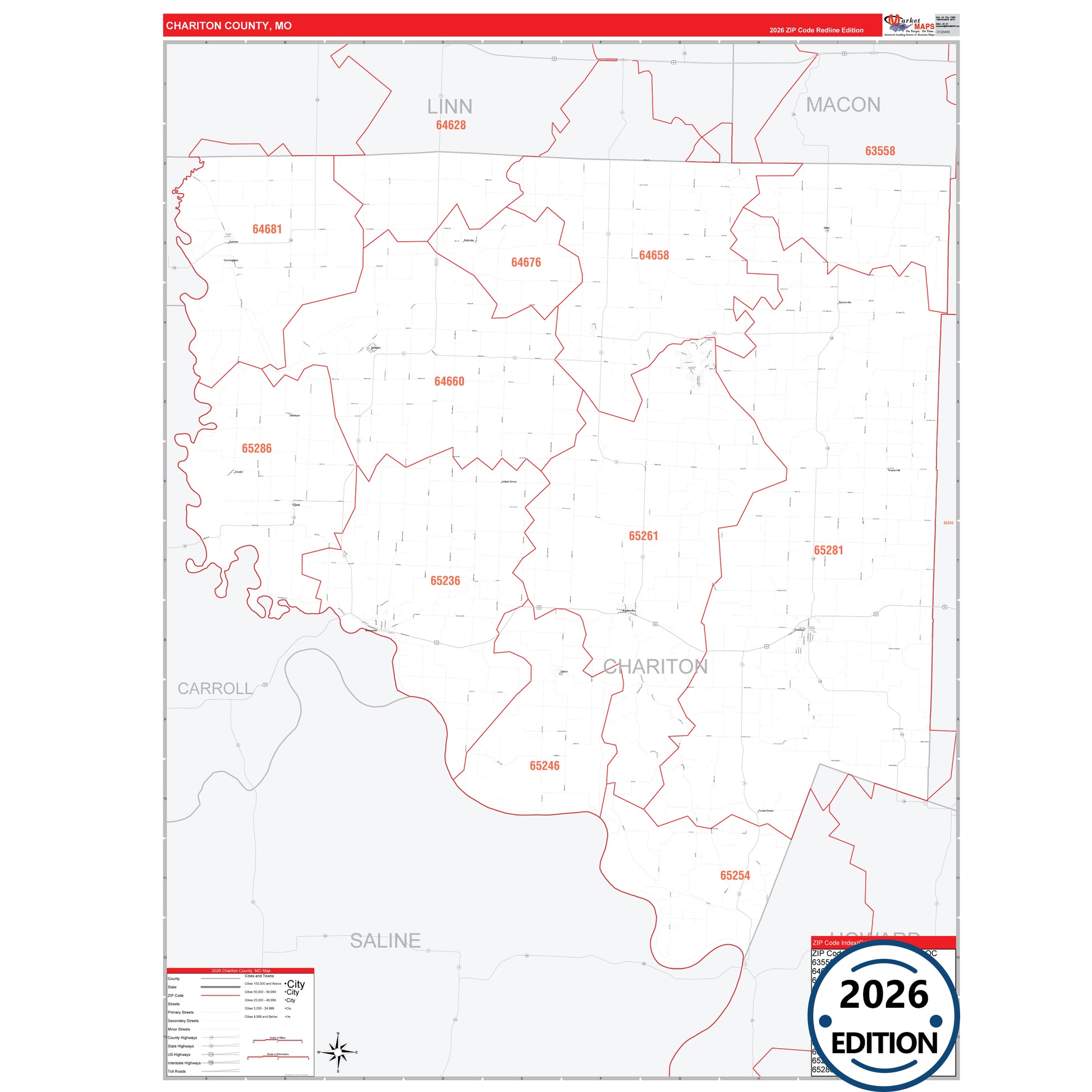The RedLine Style map of Chariton County, MO shows ZIP code areas overlaid on a detailed road network of Chariton County, Missouri. Ideal for drawing locations, territories, and other applications. Base map features include all major streets and highways labeled, cities and towns, county and state boundaries, neighborhood names, railroads, and a clean white background suitable for marking and planning.