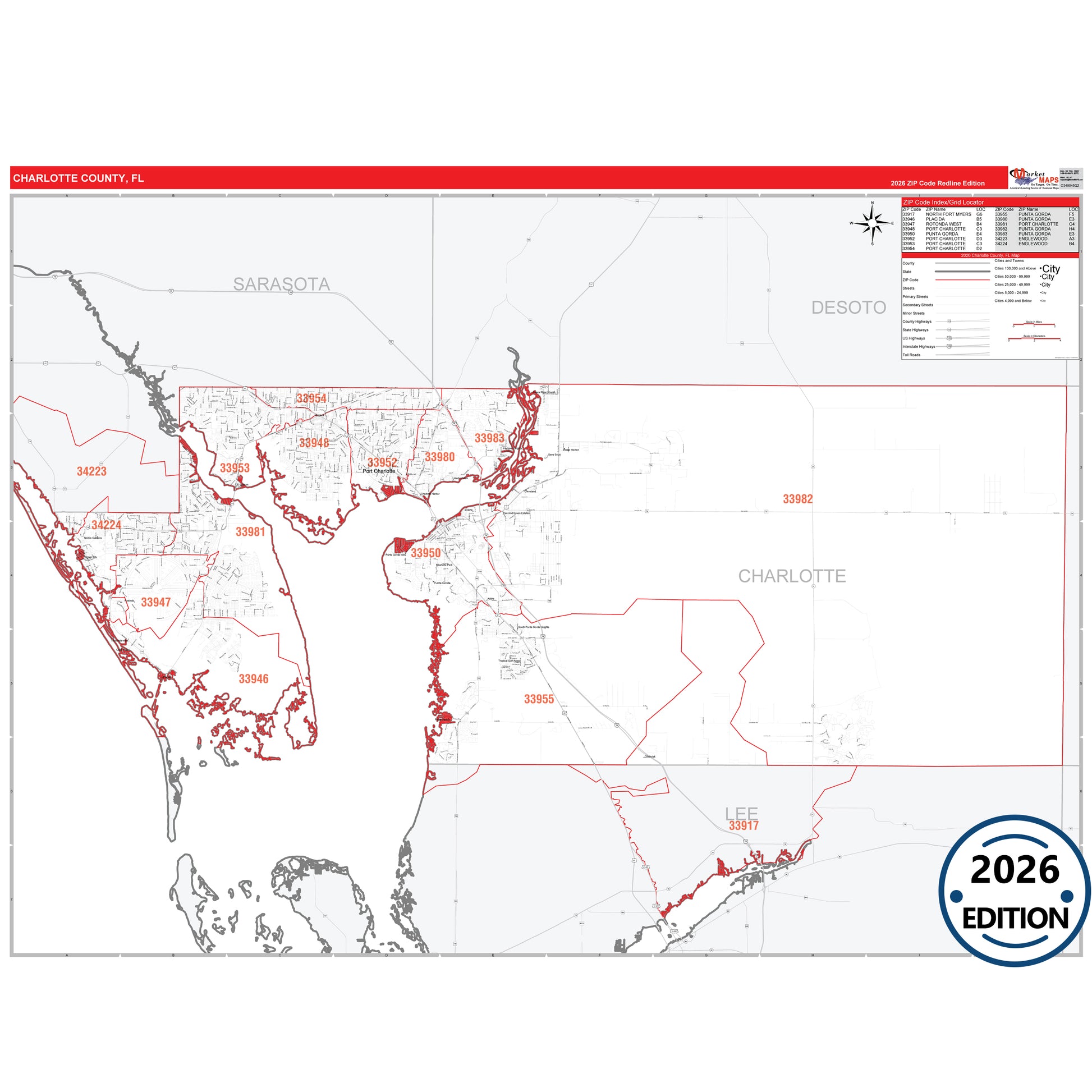 The RedLine Style map of Charlotte County, FL shows ZIP code areas overlaid on a detailed road network of Charlotte County, Florida. Ideal for drawing locations, territories, and other applications. Base map features include all major streets and highways labeled, cities and towns, county and state boundaries, neighborhood names, railroads, and a clean white background suitable for marking and planning.