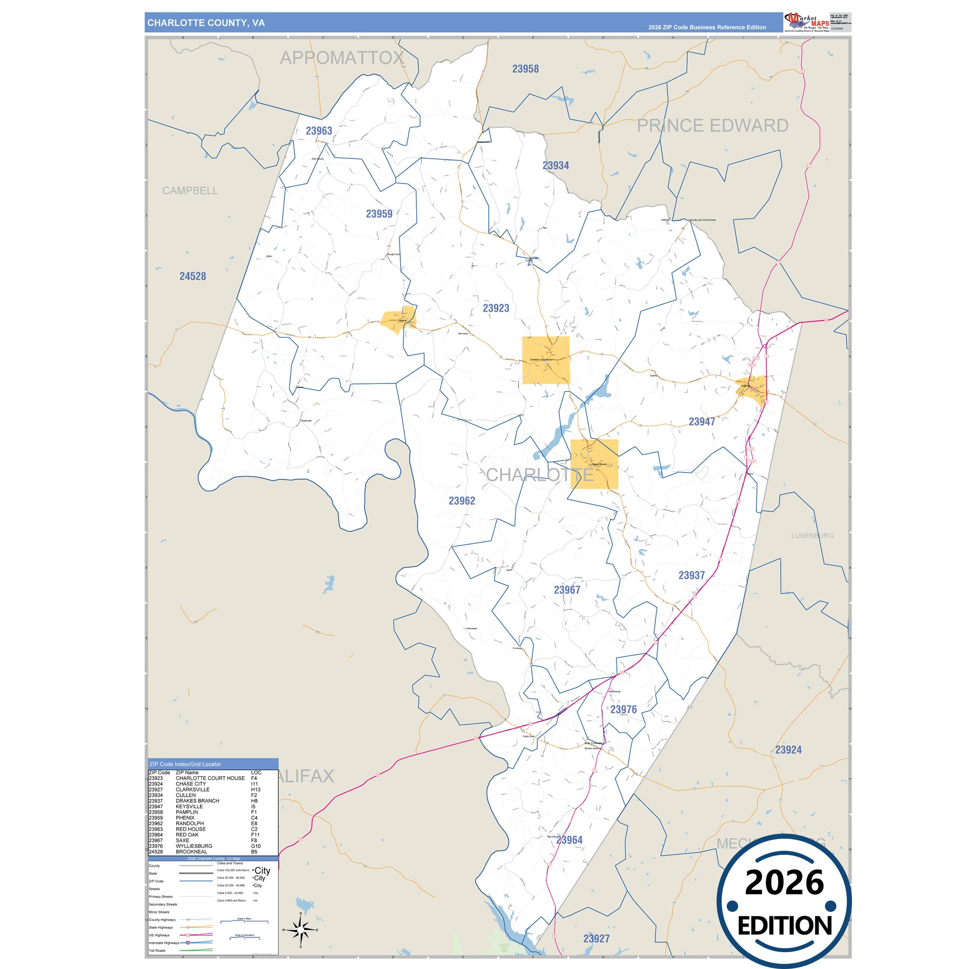 The Business Reference Style Charlotte County, VA is a detailed map that includes all towns, cities, major roadways, and highways. Available in multiple wall map sizes, perfect for home, school, office, or business display.