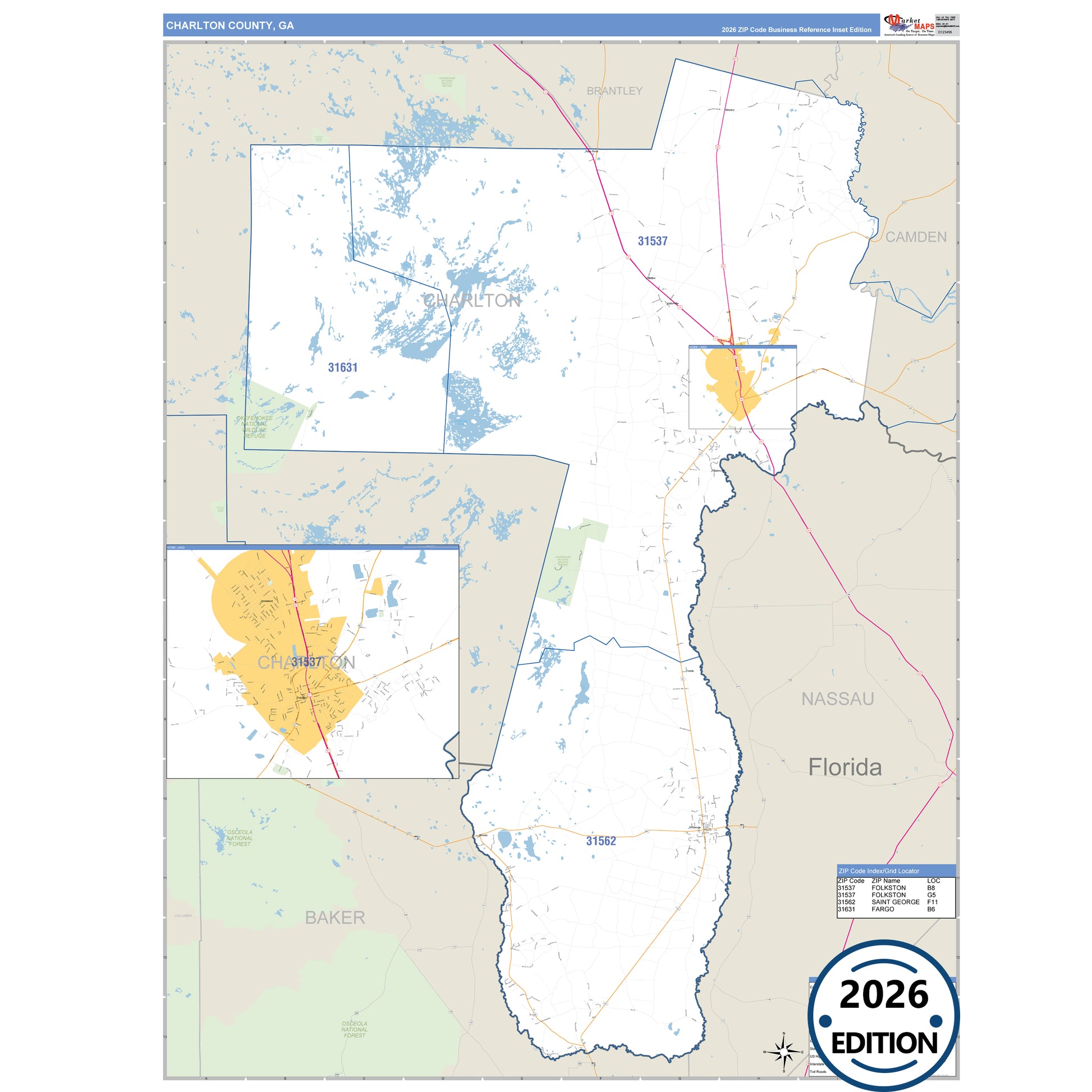 The Business Reference Style Charlton County, GA is a detailed map that includes all towns, cities, major roadways, and highways. Available in multiple wall map sizes, perfect for home, school, office, or business display.
