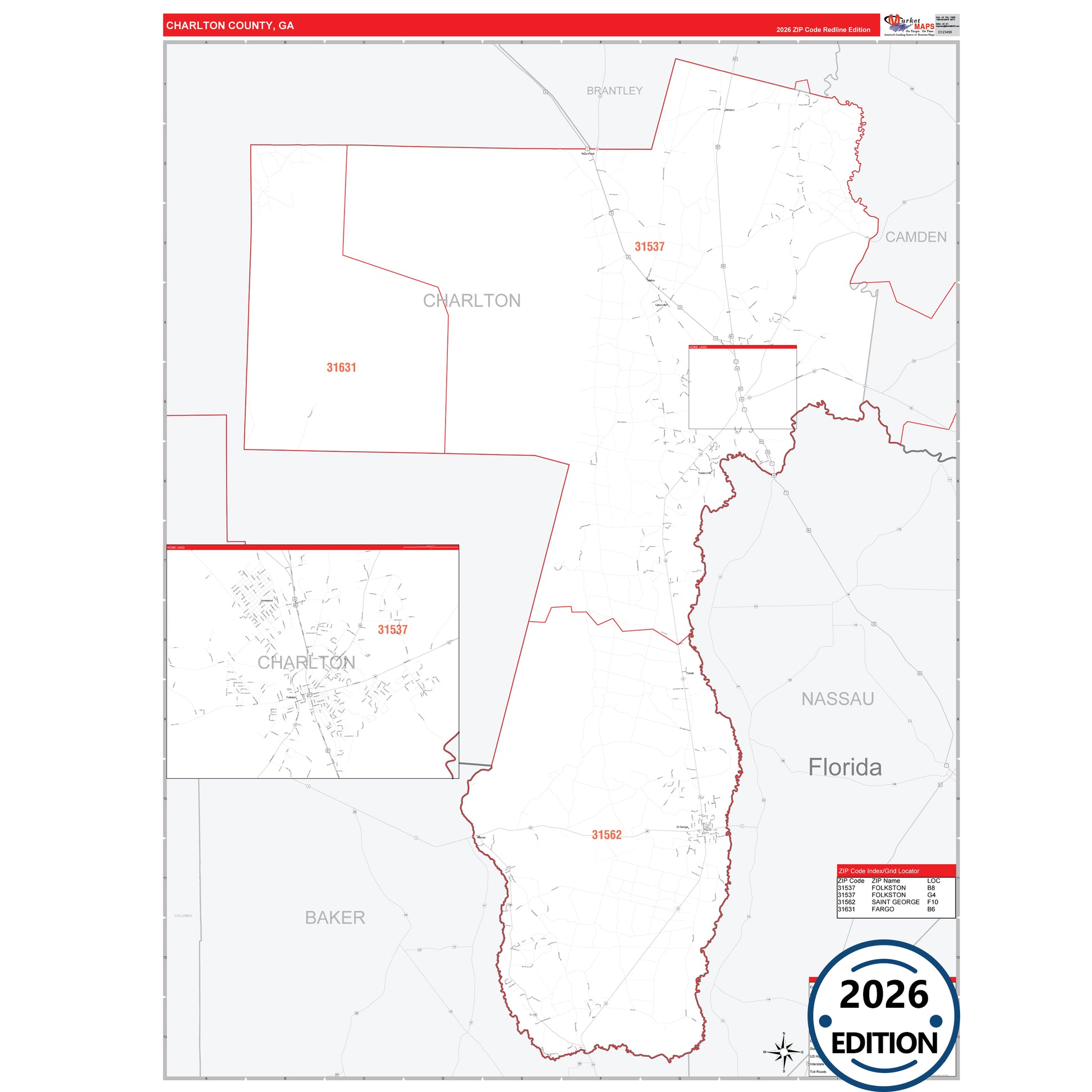The RedLine Style map of Charlton County, GA shows ZIP code areas overlaid on a detailed road network of Charlton County, Georgia. Ideal for drawing locations, territories, and other applications. Base map features include all major streets and highways labeled, cities and towns, county and state boundaries, neighborhood names, railroads, and a clean white background suitable for marking and planning.
