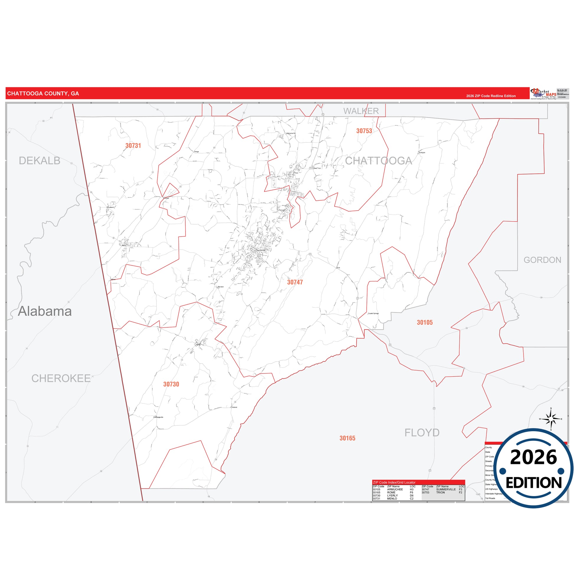 The RedLine Style map of Chattooga County, GA shows ZIP code areas overlaid on a detailed road network of Chattooga County, Georgia. Ideal for drawing locations, territories, and other applications. Base map features include all major streets and highways labeled, cities and towns, county and state boundaries, neighborhood names, railroads, and a clean white background suitable for marking and planning.
