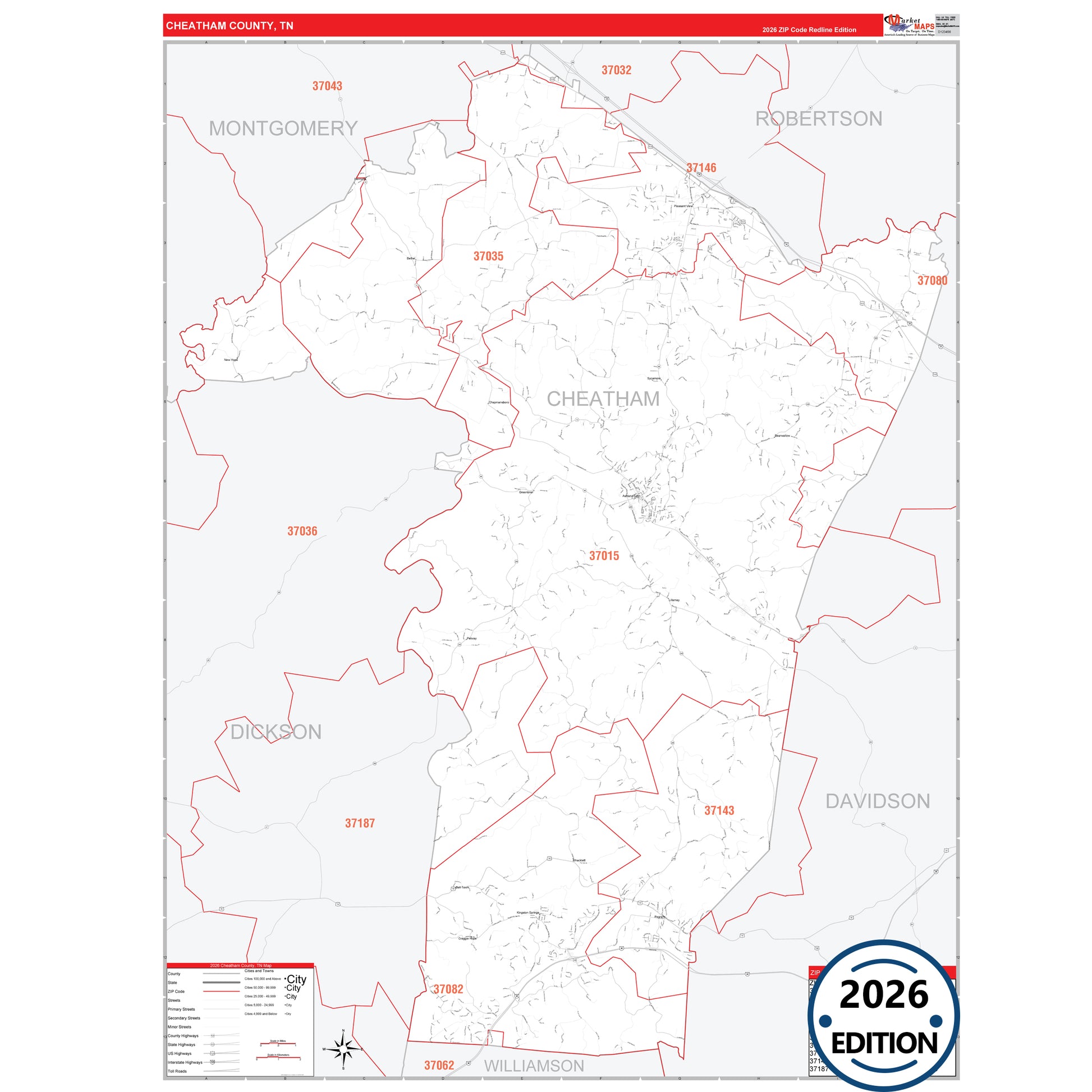 The RedLine Style map of Cheatham County, TN shows ZIP code areas overlaid on a detailed road network of Cheatham County, Tennessee. Ideal for drawing locations, territories, and other applications. Base map features include all major streets and highways labeled, cities and towns, county and state boundaries, neighborhood names, railroads, and a clean white background suitable for marking and planning.