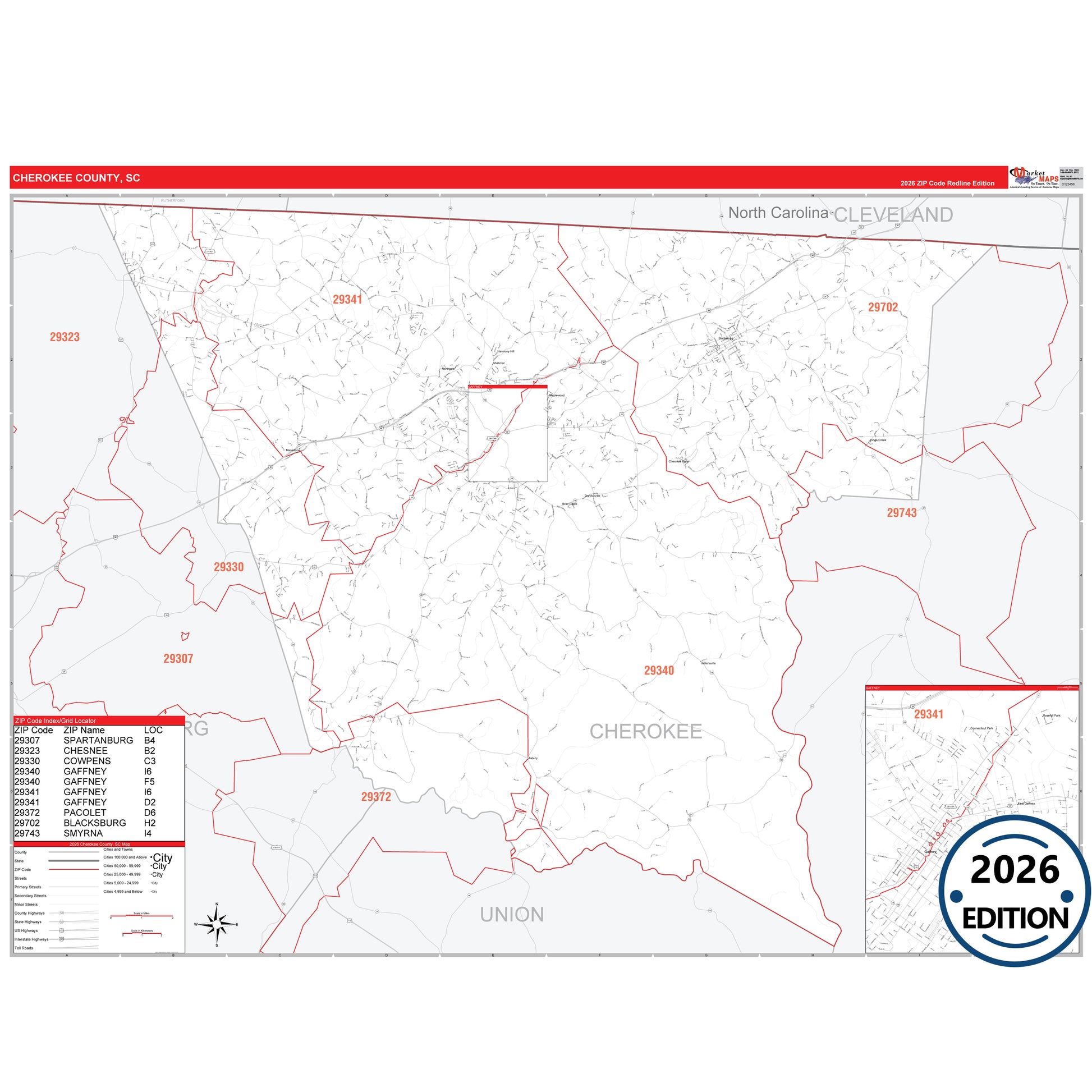 The RedLine Style map of Cherokee County, SC shows ZIP code areas overlaid on a detailed road network of Cherokee County, South Carolina. Ideal for drawing locations, territories, and other applications. Base map features include all major streets and highways labeled, cities and towns, county and state boundaries, neighborhood names, railroads, and a clean white background suitable for marking and planning.