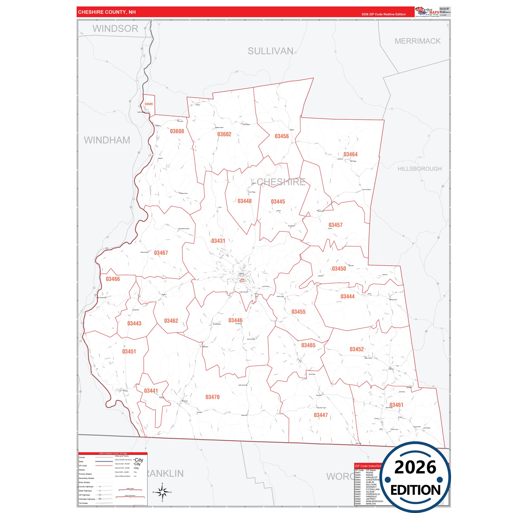 The RedLine Style map of Cheshire County, NH shows ZIP code areas overlaid on a detailed road network of Cheshire County, New Hampshire. Ideal for drawing locations, territories, and other applications. Base map features include all major streets and highways labeled, cities and towns, county and state boundaries, neighborhood names, railroads, and a clean white background suitable for marking and planning.