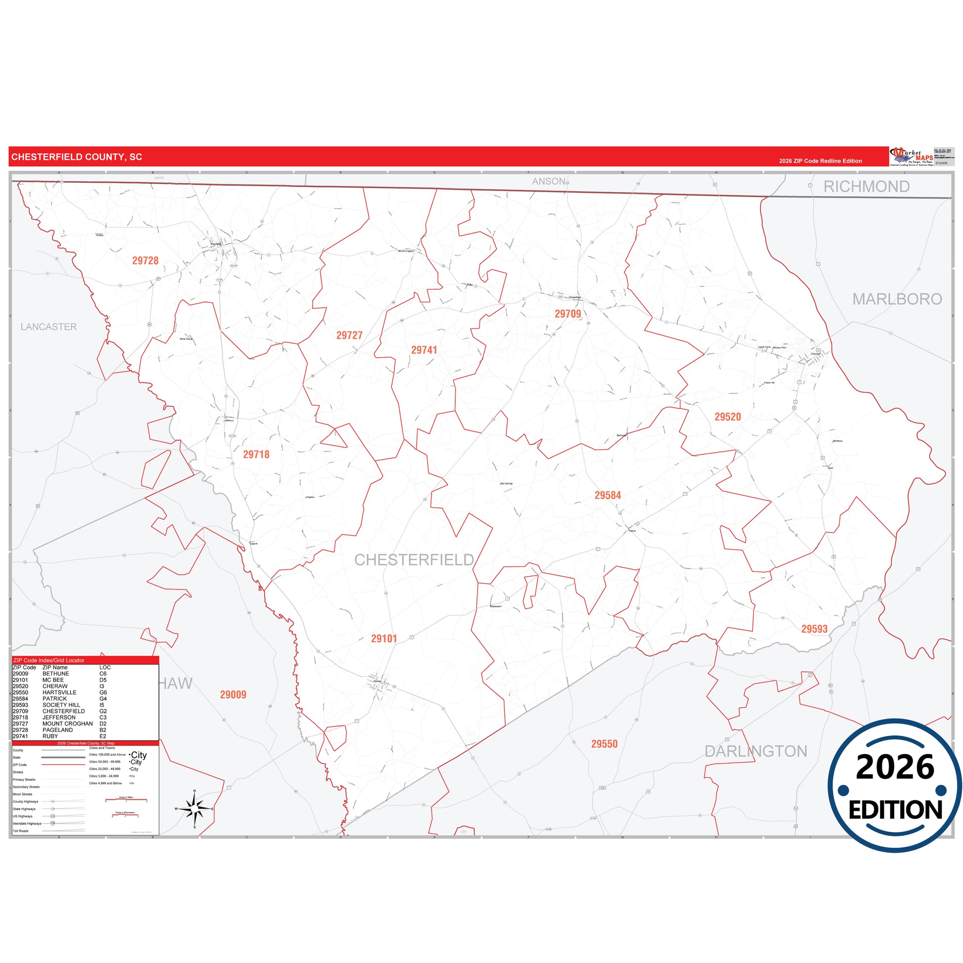 The RedLine Style map of Chesterfield County, SC shows ZIP code areas overlaid on a detailed road network of Chesterfield County, South Carolina. Ideal for drawing locations, territories, and other applications. Base map features include all major streets and highways labeled, cities and towns, county and state boundaries, neighborhood names, railroads, and a clean white background suitable for marking and planning.