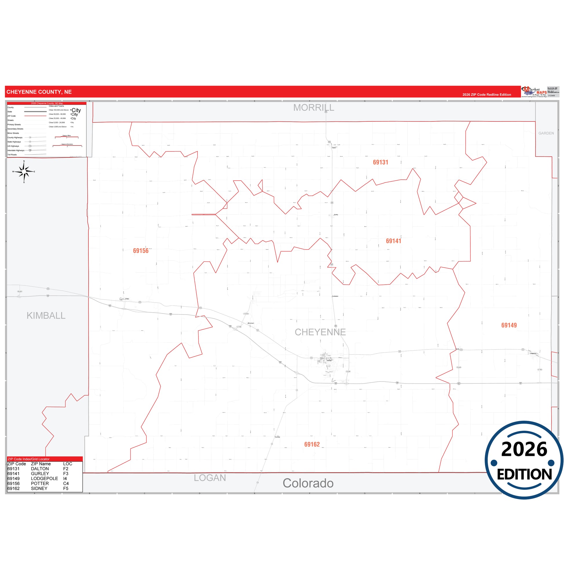 The RedLine Style map of Cheyenne County, NE shows ZIP code areas overlaid on a detailed road network of Cheyenne County, Nebraska. Ideal for drawing locations, territories, and other applications. Base map features include all major streets and highways labeled, cities and towns, county and state boundaries, neighborhood names, railroads, and a clean white background suitable for marking and planning.