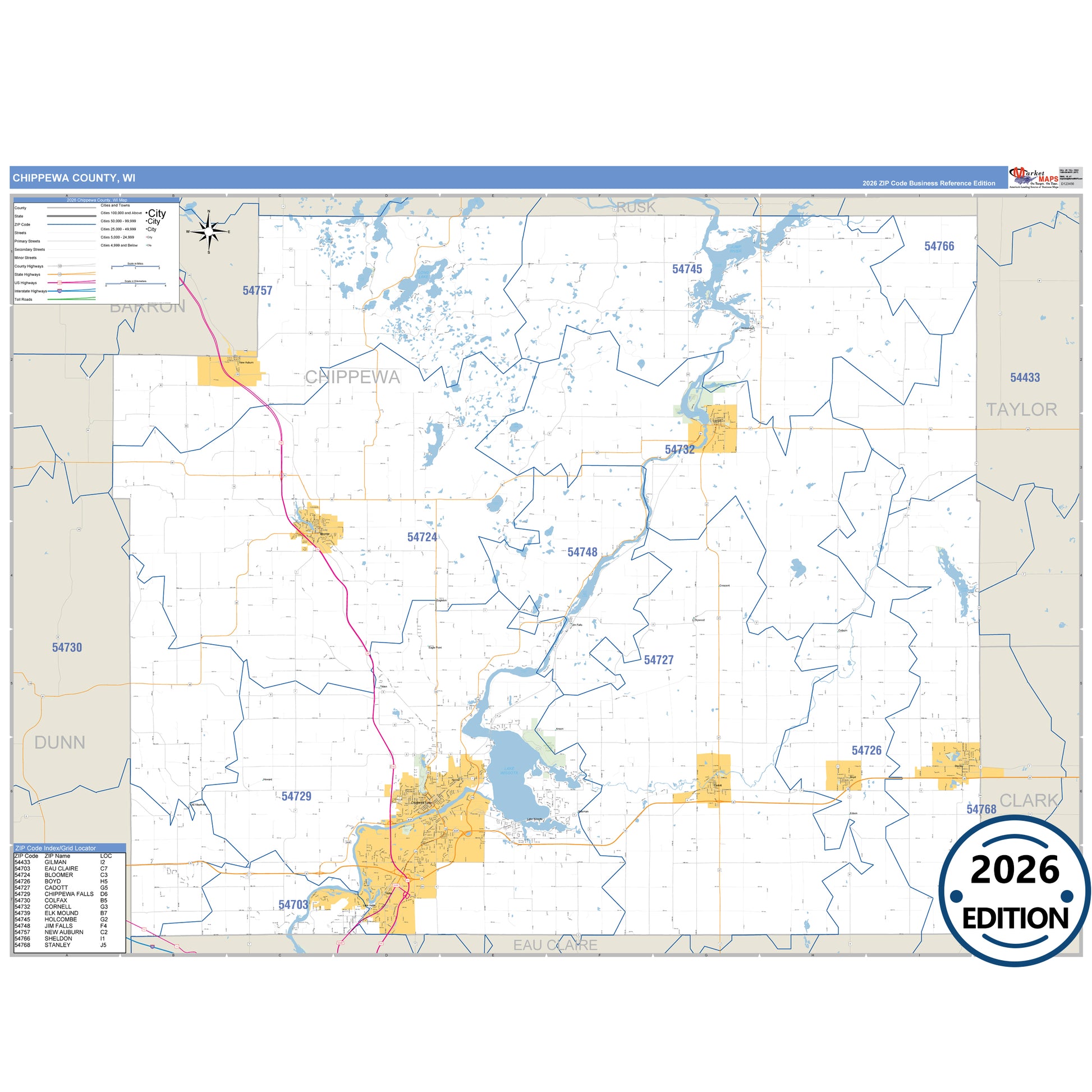 The Business Reference Style Chippewa County, WI is a detailed map that includes all towns, cities, major roadways, and highways. Available in multiple wall map sizes, perfect for home, school, office, or business display.