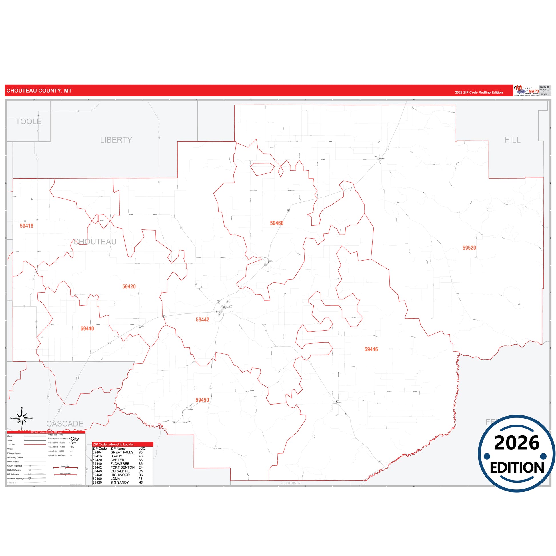 The RedLine Style map of Chouteau County, MT shows ZIP code areas overlaid on a detailed road network of Chouteau County, Montana. Ideal for drawing locations, territories, and other applications. Base map features include all major streets and highways labeled, cities and towns, county and state boundaries, neighborhood names, railroads, and a clean white background suitable for marking and planning.