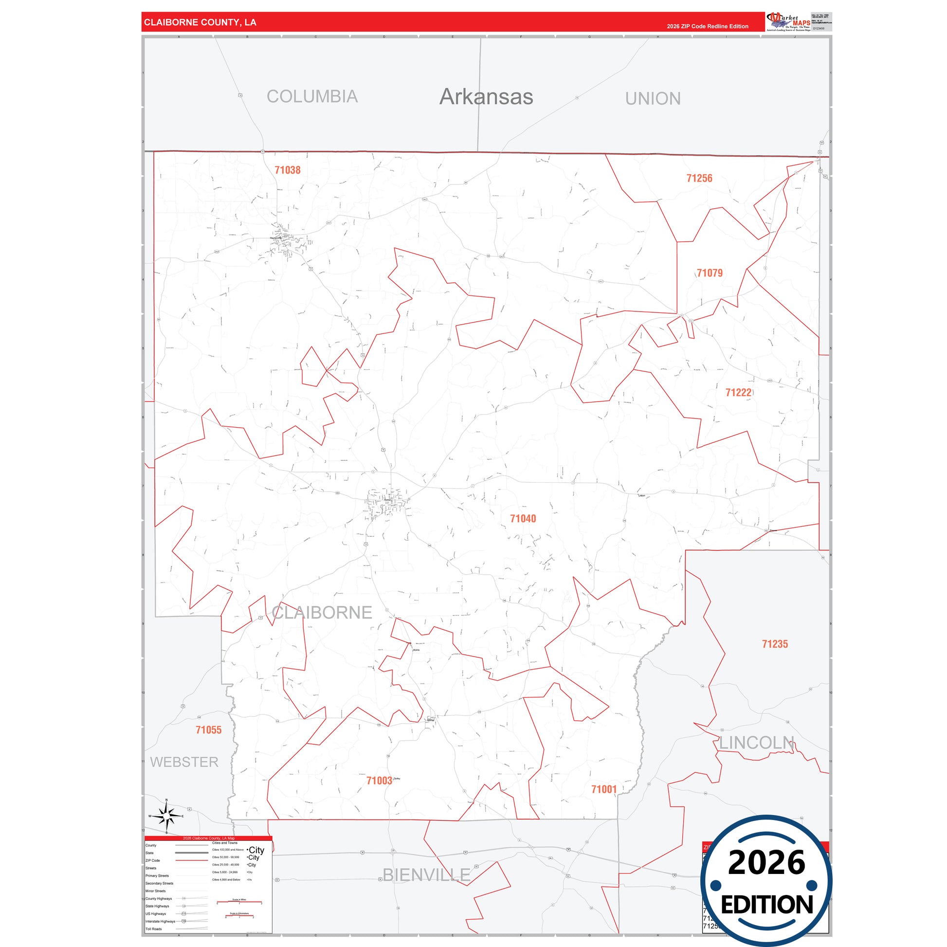 The RedLine Style map of Claiborne County, LA shows ZIP code areas overlaid on a detailed road network of Claiborne County, Louisiana. Ideal for drawing locations, territories, and other applications. Base map features include all major streets and highways labeled, cities and towns, county and state boundaries, neighborhood names, railroads, and a clean white background suitable for marking and planning.