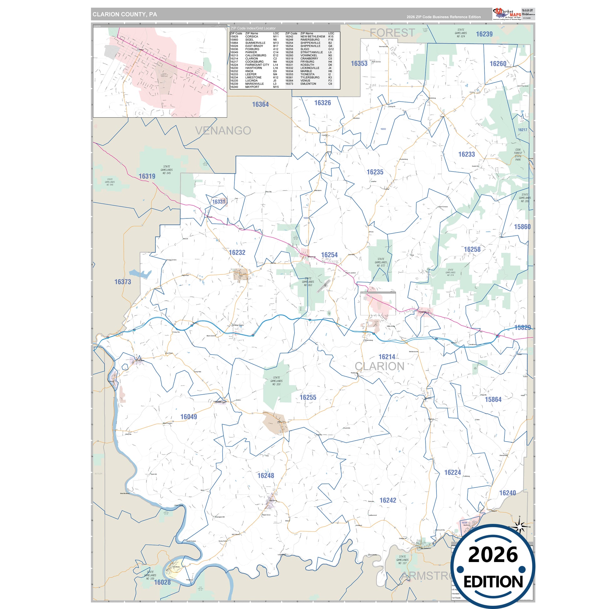 The Business Reference Style Clarion County, PA is a detailed map that includes all towns, cities, major roadways, and highways. Available in multiple wall map sizes, perfect for home, school, office, or business display.
