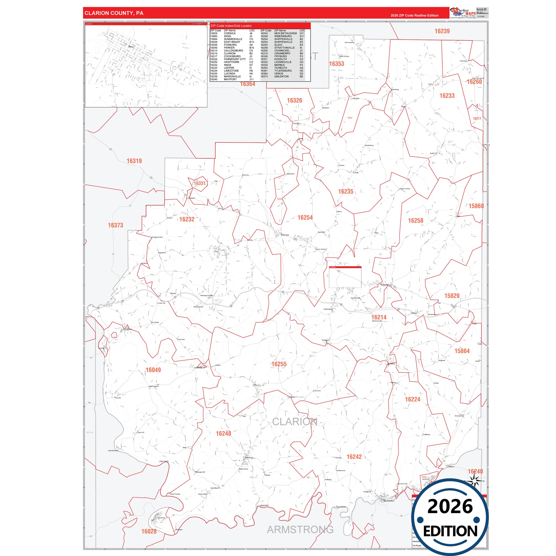 The RedLine Style map of Clarion County, PA shows ZIP code areas overlaid on a detailed road network of Clarion County, Pennsylvania. Ideal for drawing locations, territories, and other applications. Base map features include all major streets and highways labeled, cities and towns, county and state boundaries, neighborhood names, railroads, and a clean white background suitable for marking and planning.