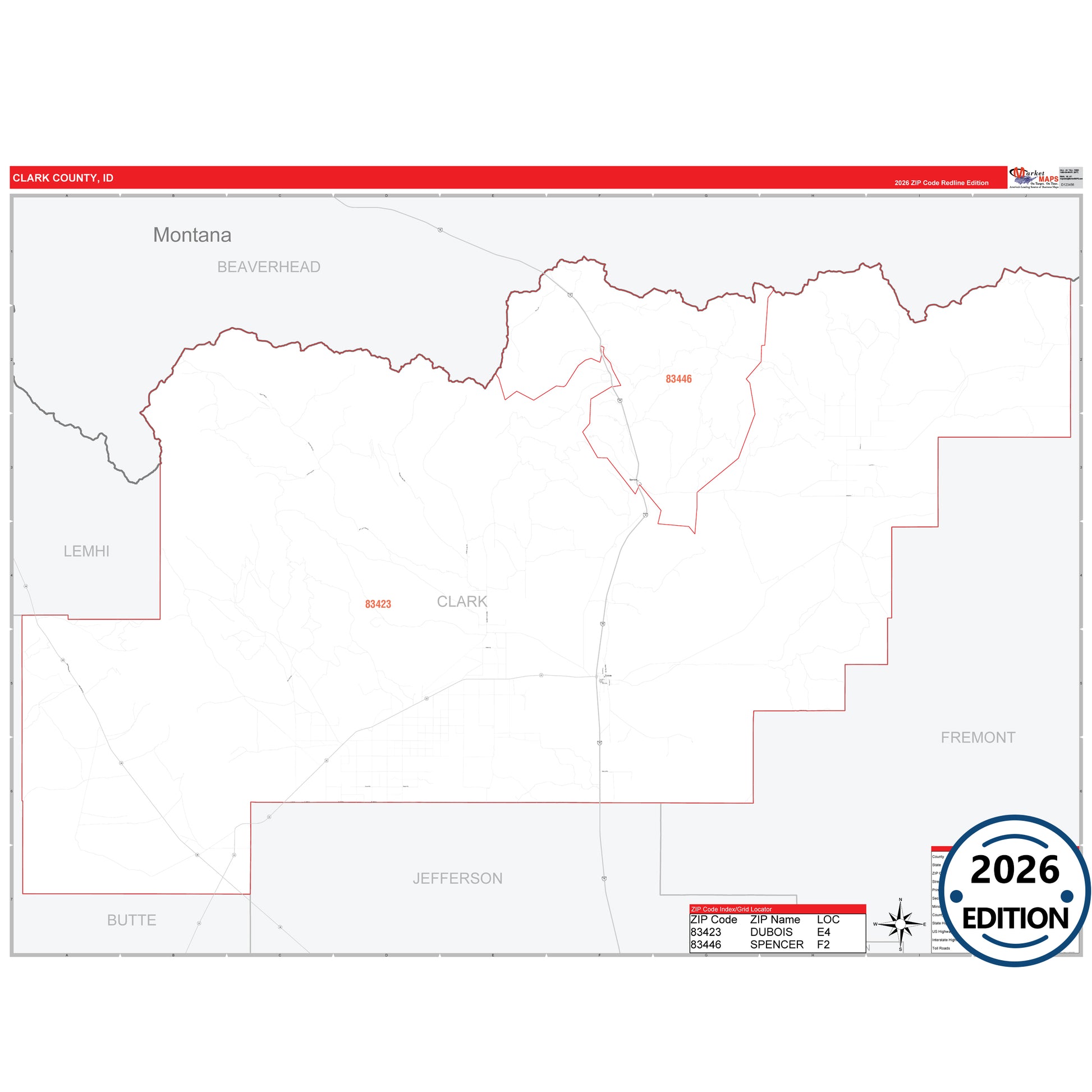 The RedLine Style map of Clark County, ID shows ZIP code areas overlaid on a detailed road network of Clark County, Idaho. Ideal for drawing locations, territories, and other applications. Base map features include all major streets and highways labeled, cities and towns, county and state boundaries, neighborhood names, railroads, and a clean white background suitable for marking and planning.