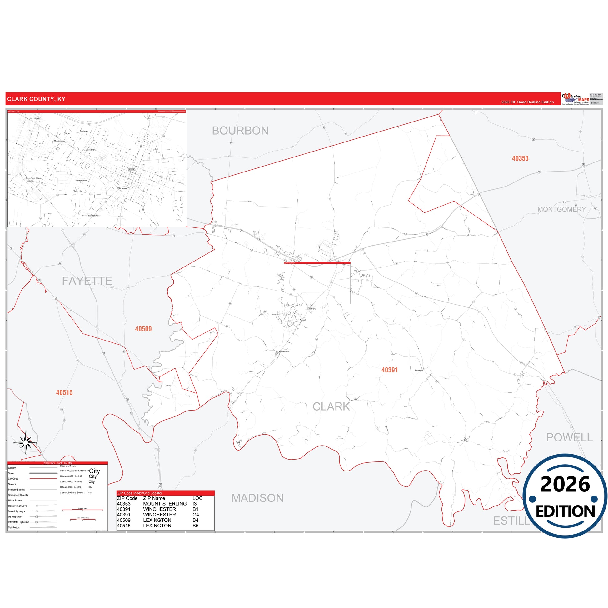 The RedLine Style map of Clark County, KY shows ZIP code areas overlaid on a detailed road network of Clark County, Kentucky. Ideal for drawing locations, territories, and other applications. Base map features include all major streets and highways labeled, cities and towns, county and state boundaries, neighborhood names, railroads, and a clean white background suitable for marking and planning.