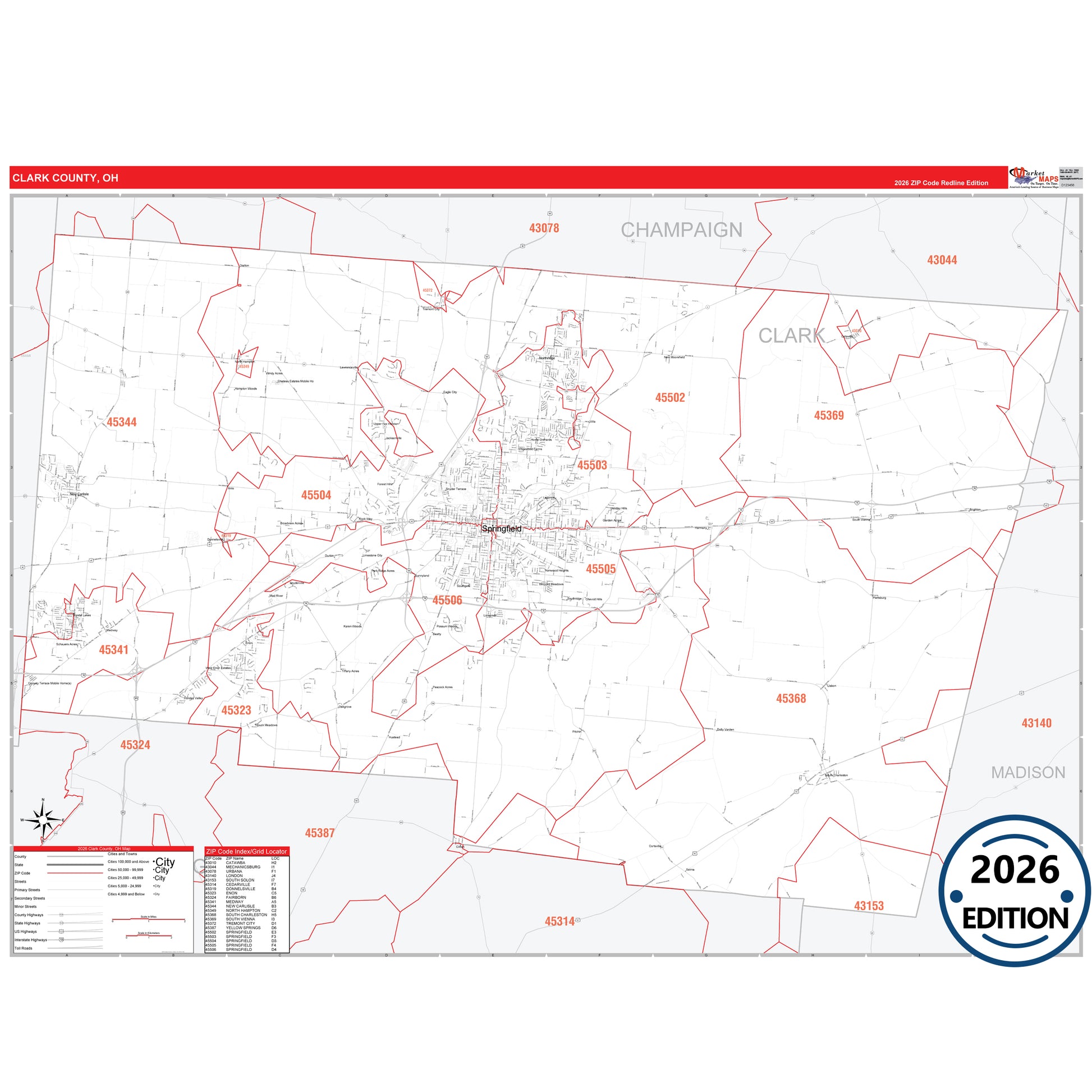 The RedLine Style map of Clark County, OH shows ZIP code areas overlaid on a detailed road network of Clark County, Ohio. Ideal for drawing locations, territories, and other applications. Base map features include all major streets and highways labeled, cities and towns, county and state boundaries, neighborhood names, railroads, and a clean white background suitable for marking and planning.
