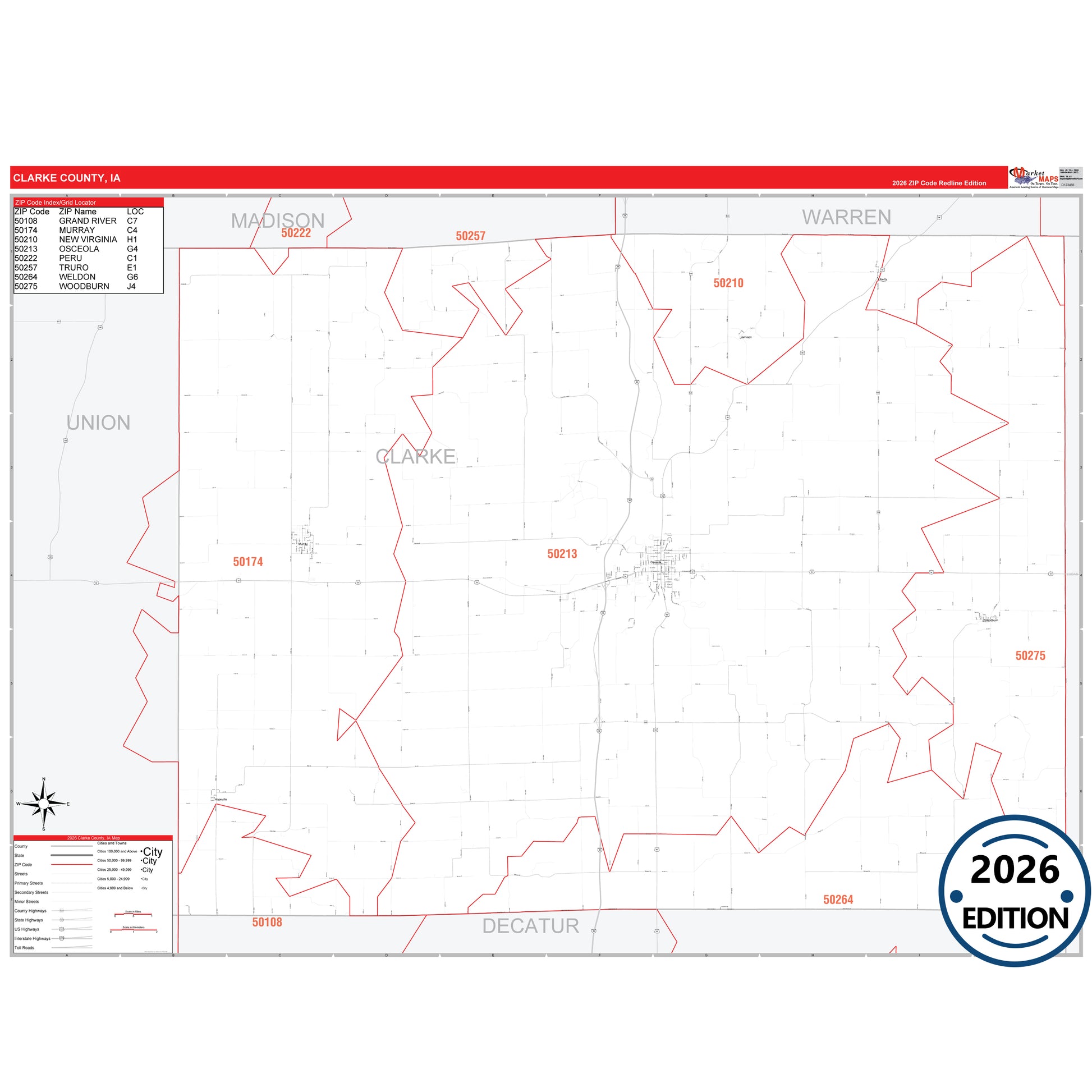 The RedLine Style map of Clarke County, IA shows ZIP code areas overlaid on a detailed road network of Clarke County, Iowa. Ideal for drawing locations, territories, and other applications. Base map features include all major streets and highways labeled, cities and towns, county and state boundaries, neighborhood names, railroads, and a clean white background suitable for marking and planning.