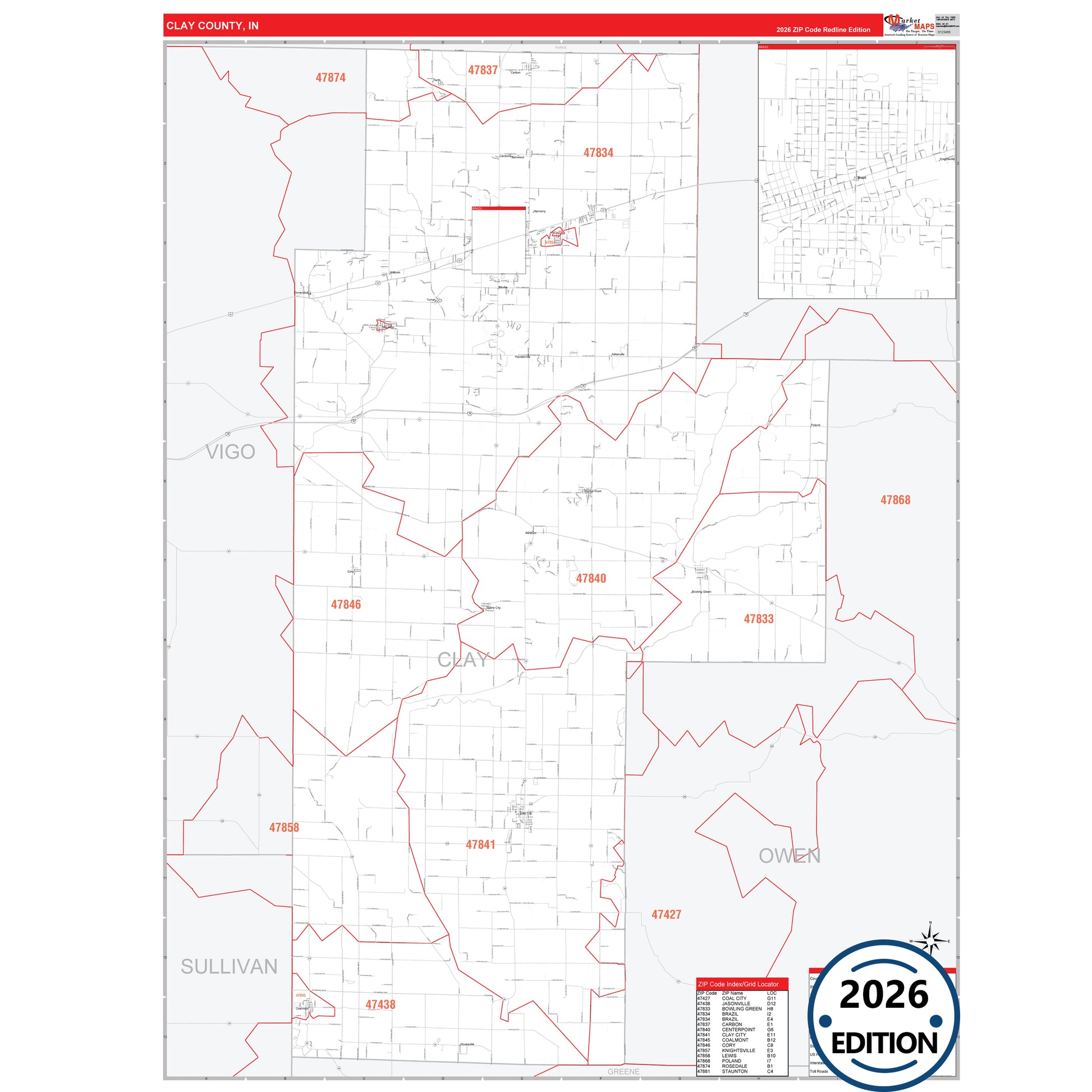 The RedLine Style map of Clay County, IN shows ZIP code areas overlaid on a detailed road network of Clay County, Indiana. Ideal for drawing locations, territories, and other applications. Base map features include all major streets and highways labeled, cities and towns, county and state boundaries, neighborhood names, railroads, and a clean white background suitable for marking and planning.