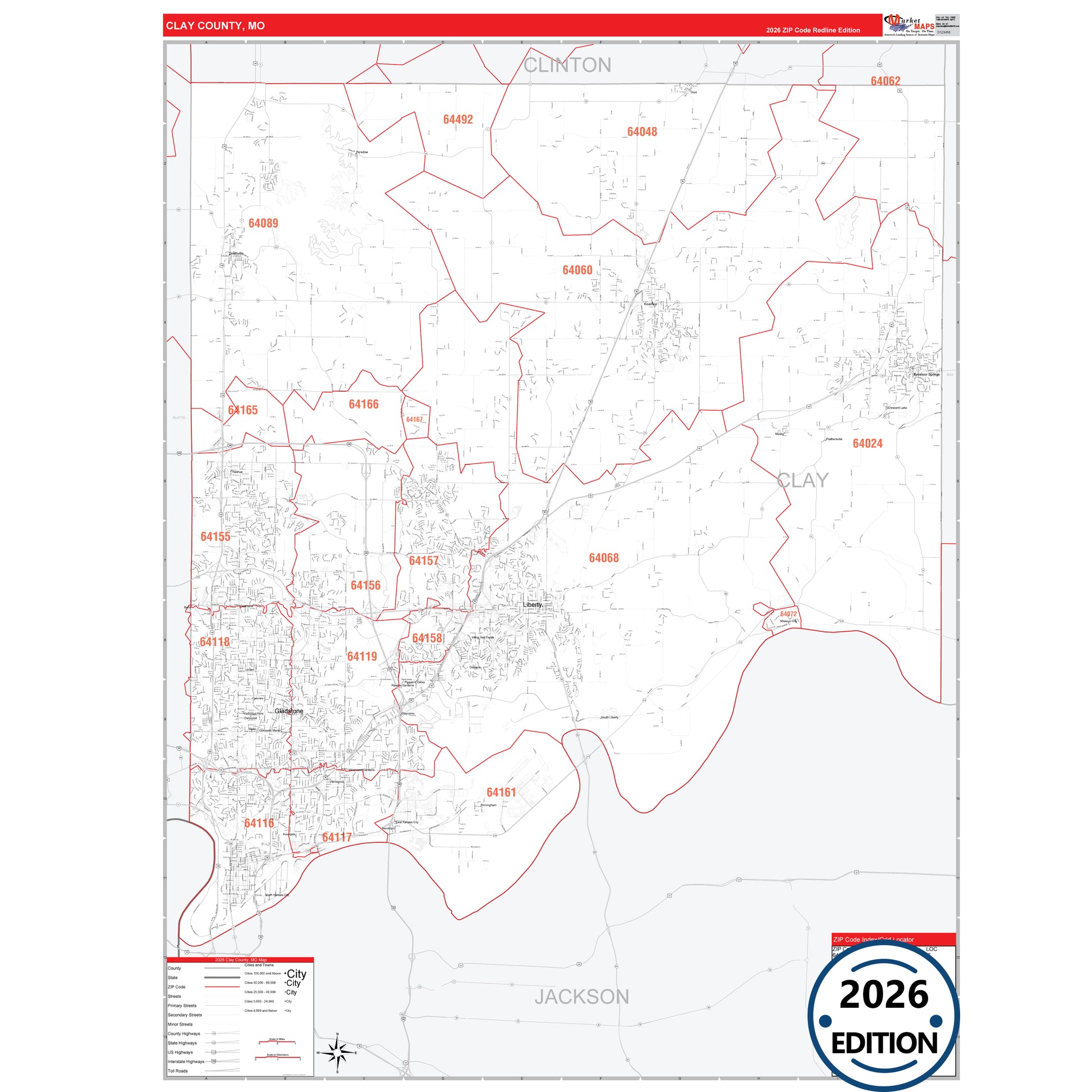 The RedLine Style map of Clay County, MO shows ZIP code areas overlaid on a detailed road network of Clay County, Missouri. Ideal for drawing locations, territories, and other applications. Base map features include all major streets and highways labeled, cities and towns, county and state boundaries, neighborhood names, railroads, and a clean white background suitable for marking and planning.