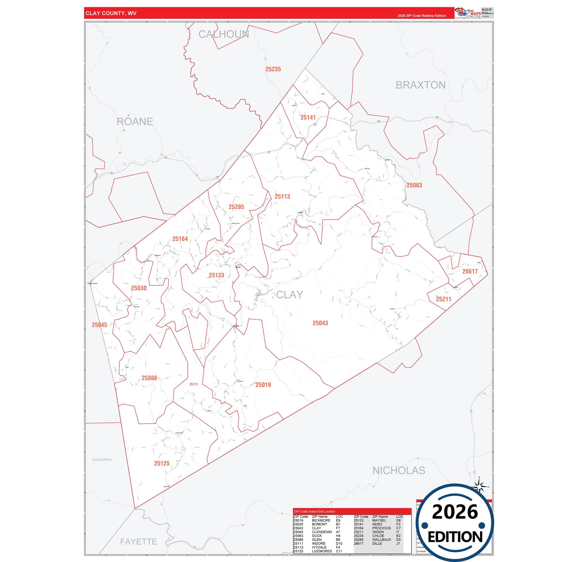 The RedLine Style map of Clay County, WV shows ZIP code areas overlaid on a detailed road network of Clay County, West Virginia. Ideal for drawing locations, territories, and other applications. Base map features include all major streets and highways labeled, cities and towns, county and state boundaries, neighborhood names, railroads, and a clean white background suitable for marking and planning.