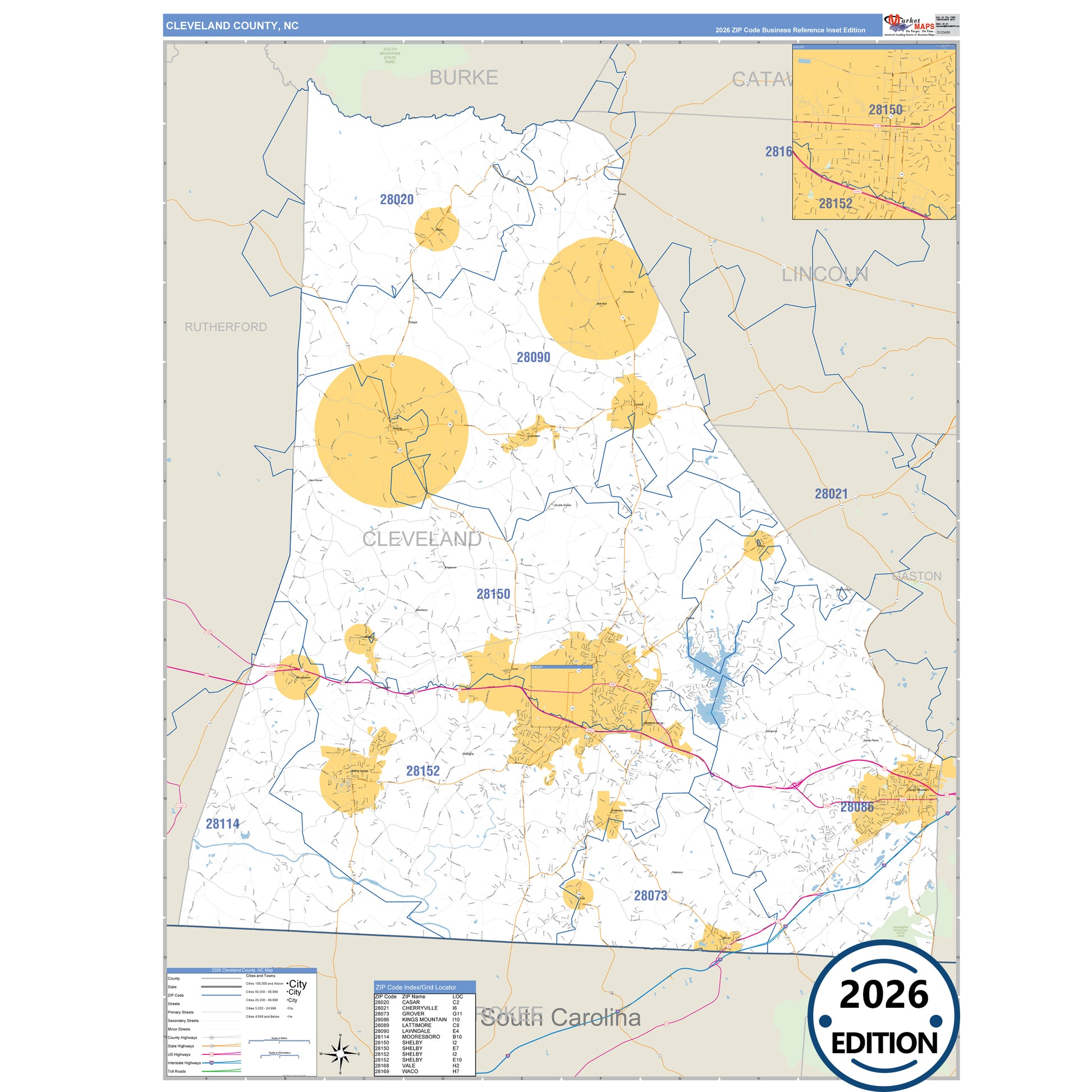 The Business Reference Style Cleveland County, NC is a detailed map that includes all towns, cities, major roadways, and highways. Available in multiple wall map sizes, perfect for home, school, office, or business display.
