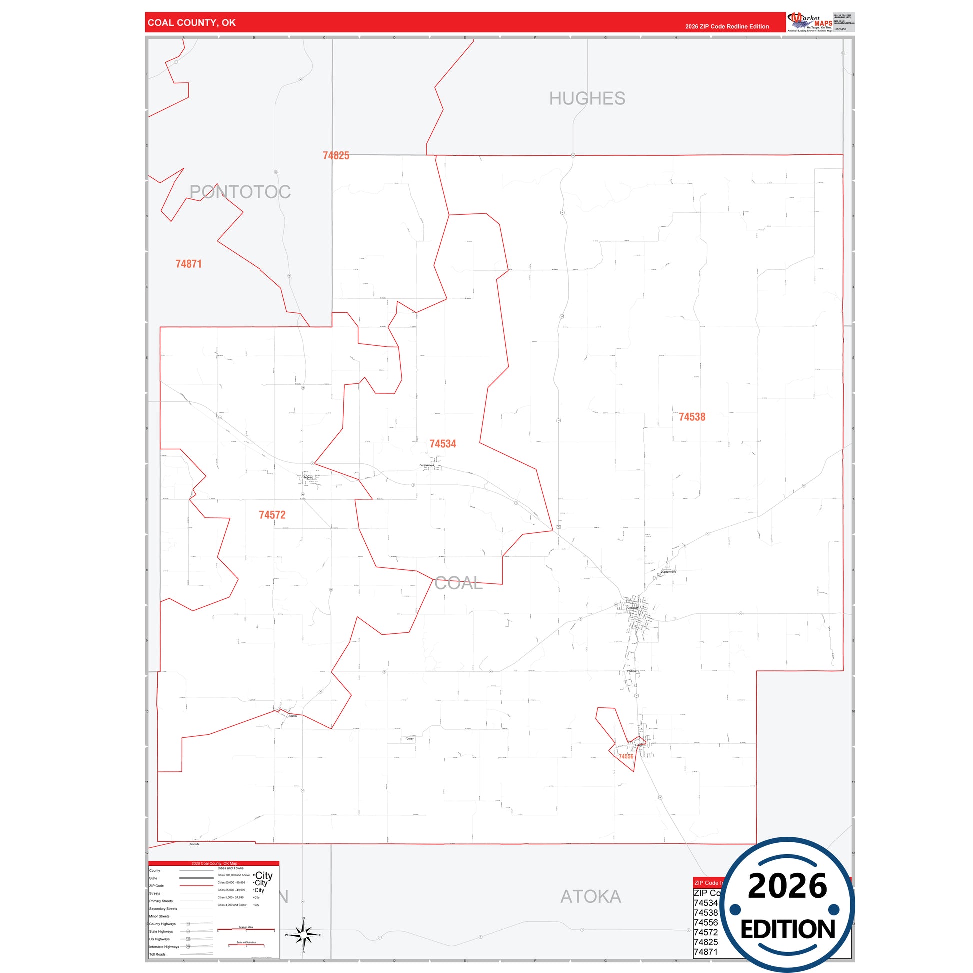 The RedLine Style map of Coal County, OK shows ZIP code areas overlaid on a detailed road network of Coal County, Oklahoma. Ideal for drawing locations, territories, and other applications. Base map features include all major streets and highways labeled, cities and towns, county and state boundaries, neighborhood names, railroads, and a clean white background suitable for marking and planning.