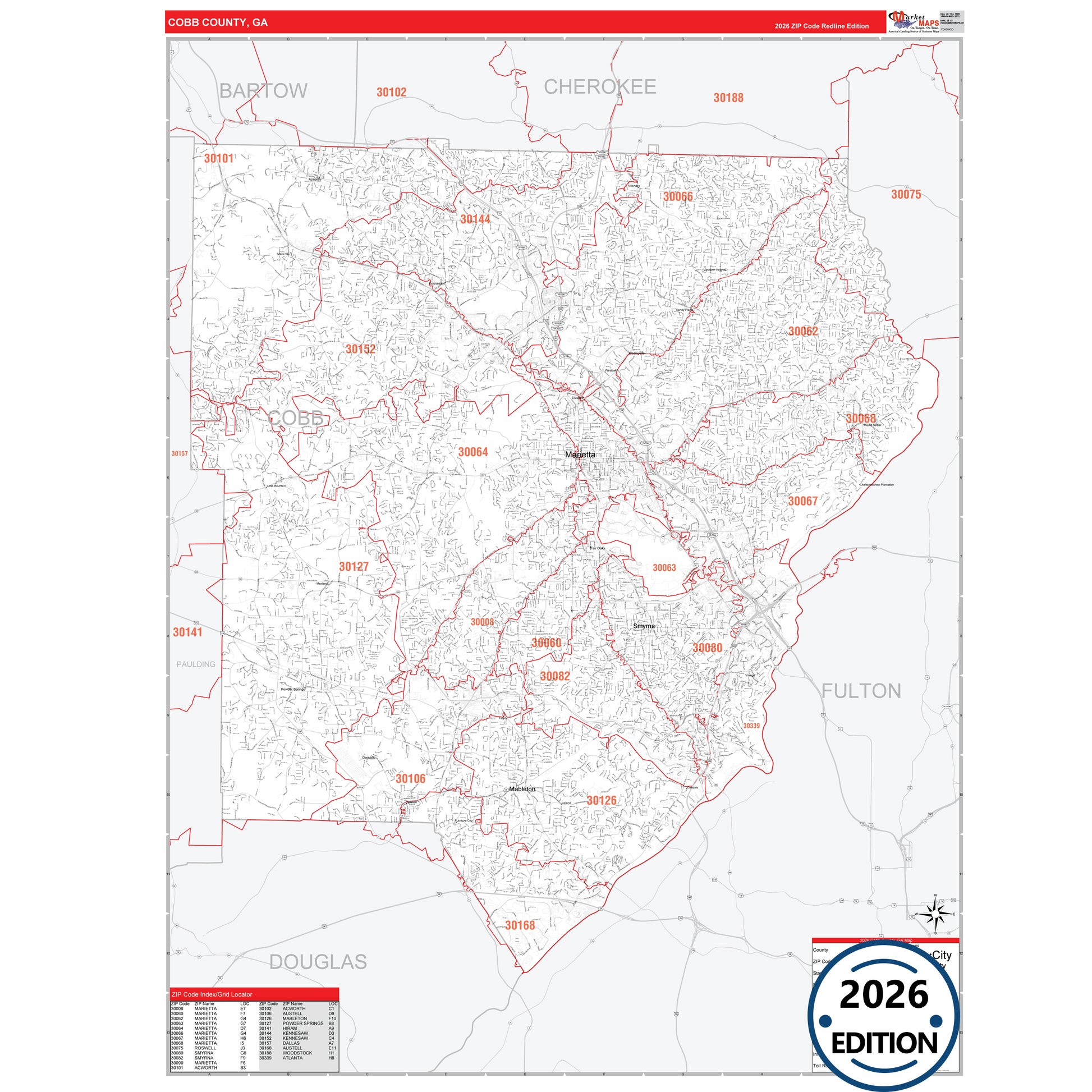 The RedLine Style map of Cobb County, GA shows ZIP code areas overlaid on a detailed road network of Cobb County, Georgia. Ideal for drawing locations, territories, and other applications. Base map features include all major streets and highways labeled, cities and towns, county and state boundaries, neighborhood names, railroads, and a clean white background suitable for marking and planning.