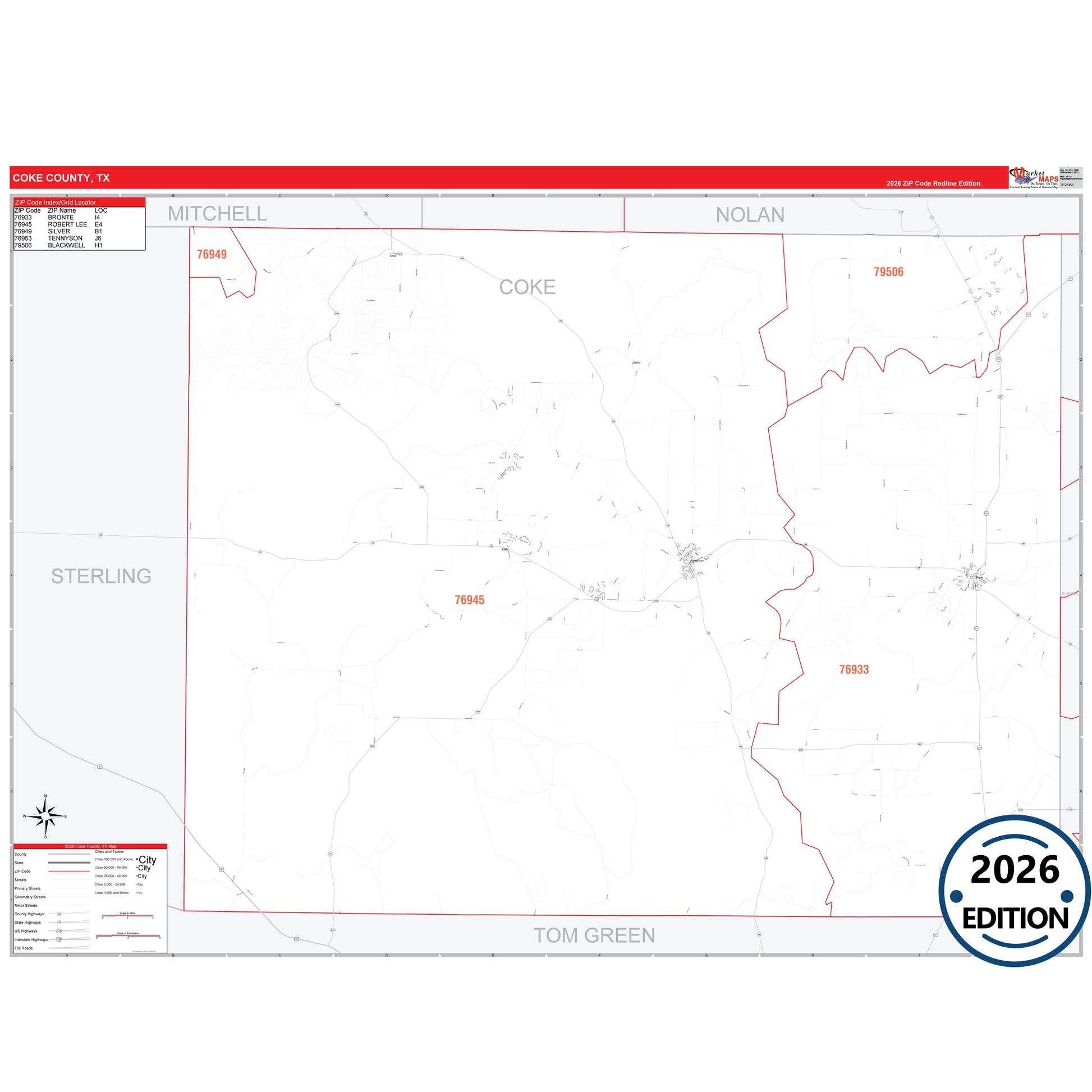 The RedLine Style map of Coke County, TX shows ZIP code areas overlaid on a detailed road network of Coke County, Texas. Ideal for drawing locations, territories, and other applications. Base map features include all major streets and highways labeled, cities and towns, county and state boundaries, neighborhood names, railroads, and a clean white background suitable for marking and planning.