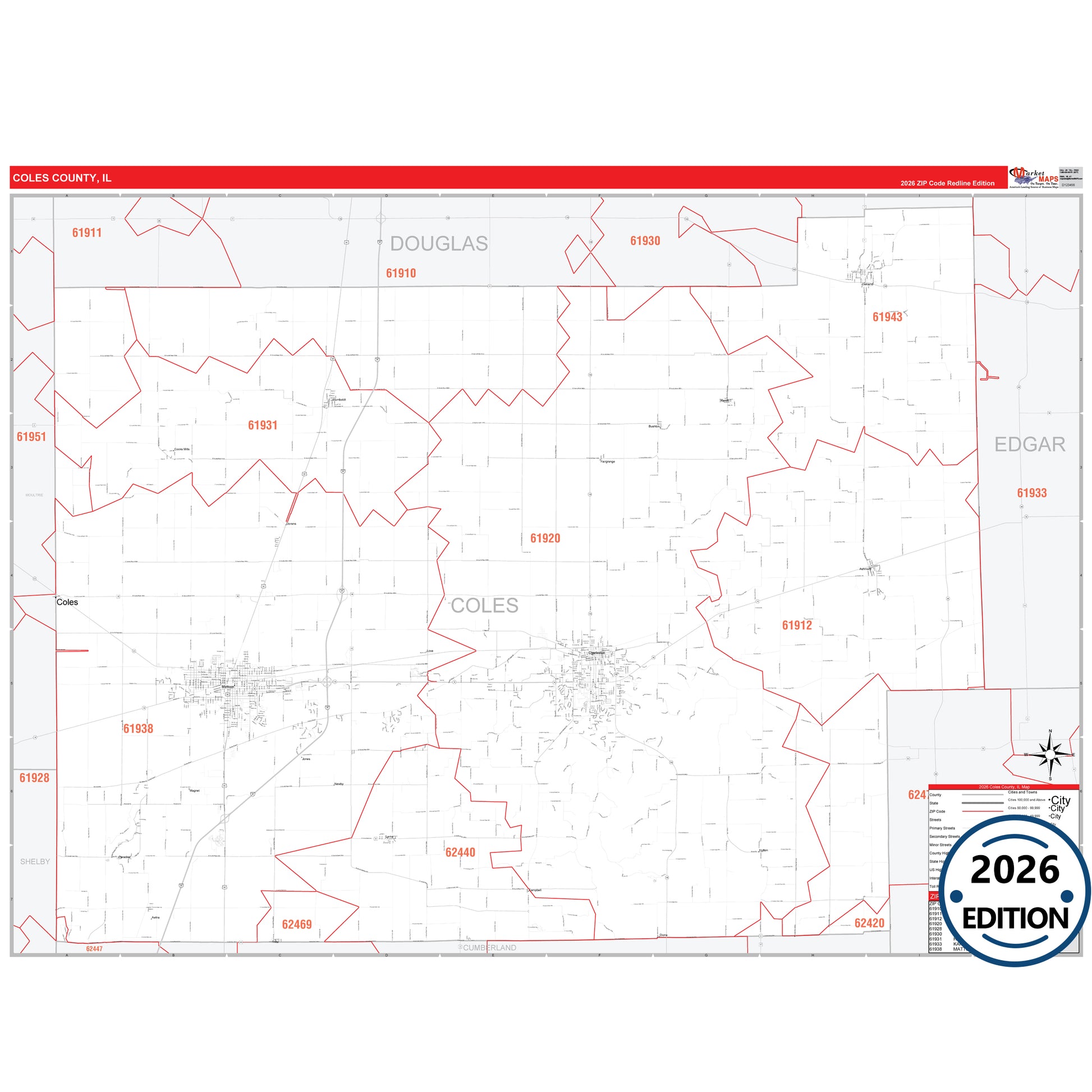 The RedLine Style map of Coles County, IL shows ZIP code areas overlaid on a detailed road network of Coles County, Illinois. Ideal for drawing locations, territories, and other applications. Base map features include all major streets and highways labeled, cities and towns, county and state boundaries, neighborhood names, railroads, and a clean white background suitable for marking and planning.