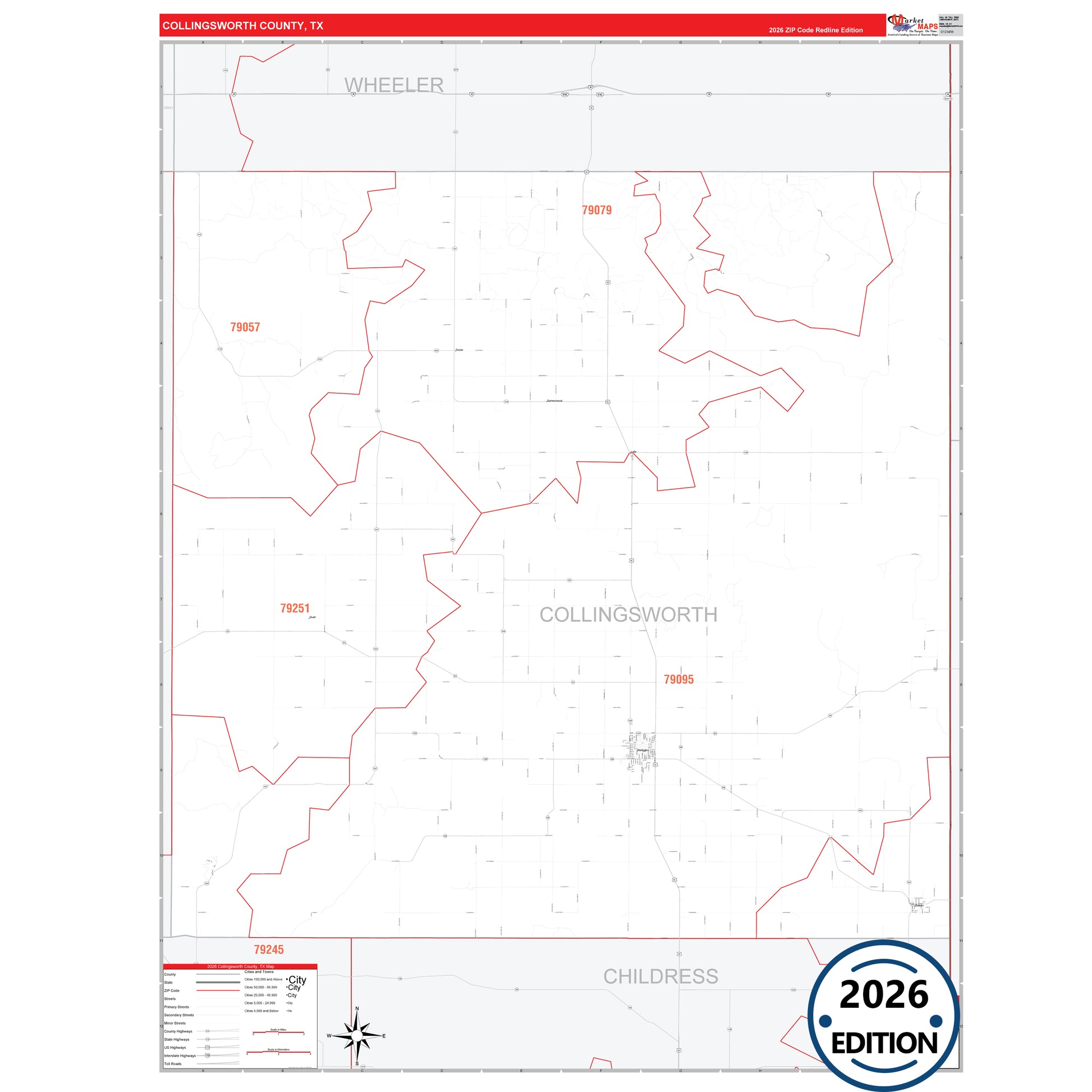 The RedLine Style map of Collingsworth County, TX shows ZIP code areas overlaid on a detailed road network of Collingsworth County, Texas. Ideal for drawing locations, territories, and other applications. Base map features include all major streets and highways labeled, cities and towns, county and state boundaries, neighborhood names, railroads, and a clean white background suitable for marking and planning.