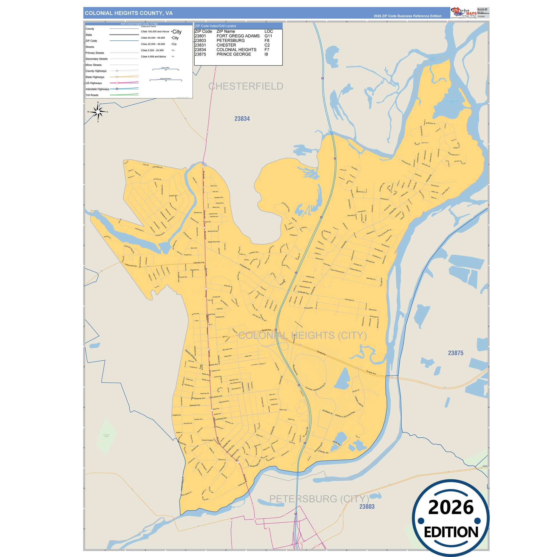 The Business Reference Style Colonial Heights County, VA is a detailed map that includes all towns, cities, major roadways, and highways. Available in multiple wall map sizes, perfect for home, school, office, or business display.