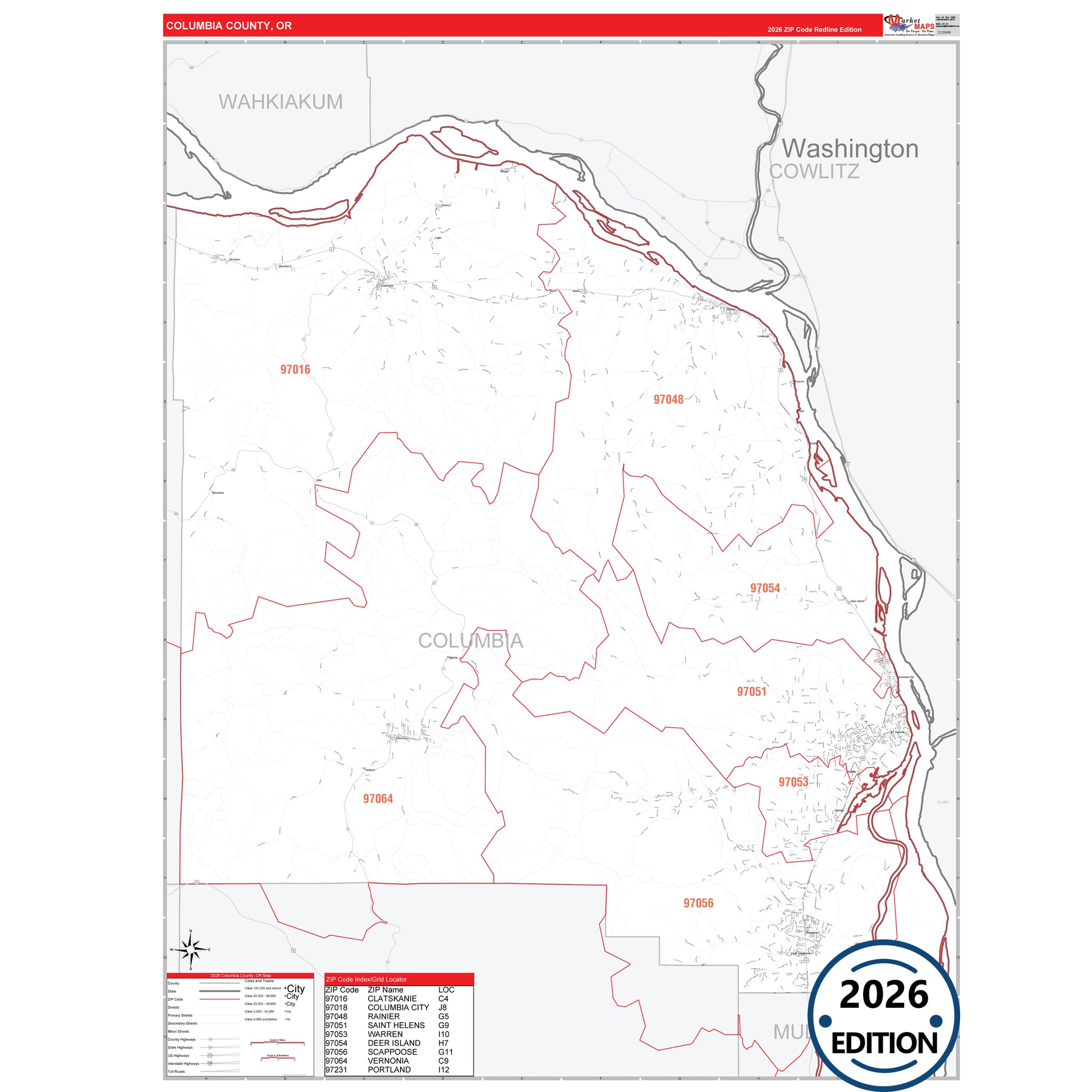 The RedLine Style map of Columbia County, OR shows ZIP code areas overlaid on a detailed road network of Columbia County, Oregon. Ideal for drawing locations, territories, and other applications. Base map features include all major streets and highways labeled, cities and towns, county and state boundaries, neighborhood names, railroads, and a clean white background suitable for marking and planning.