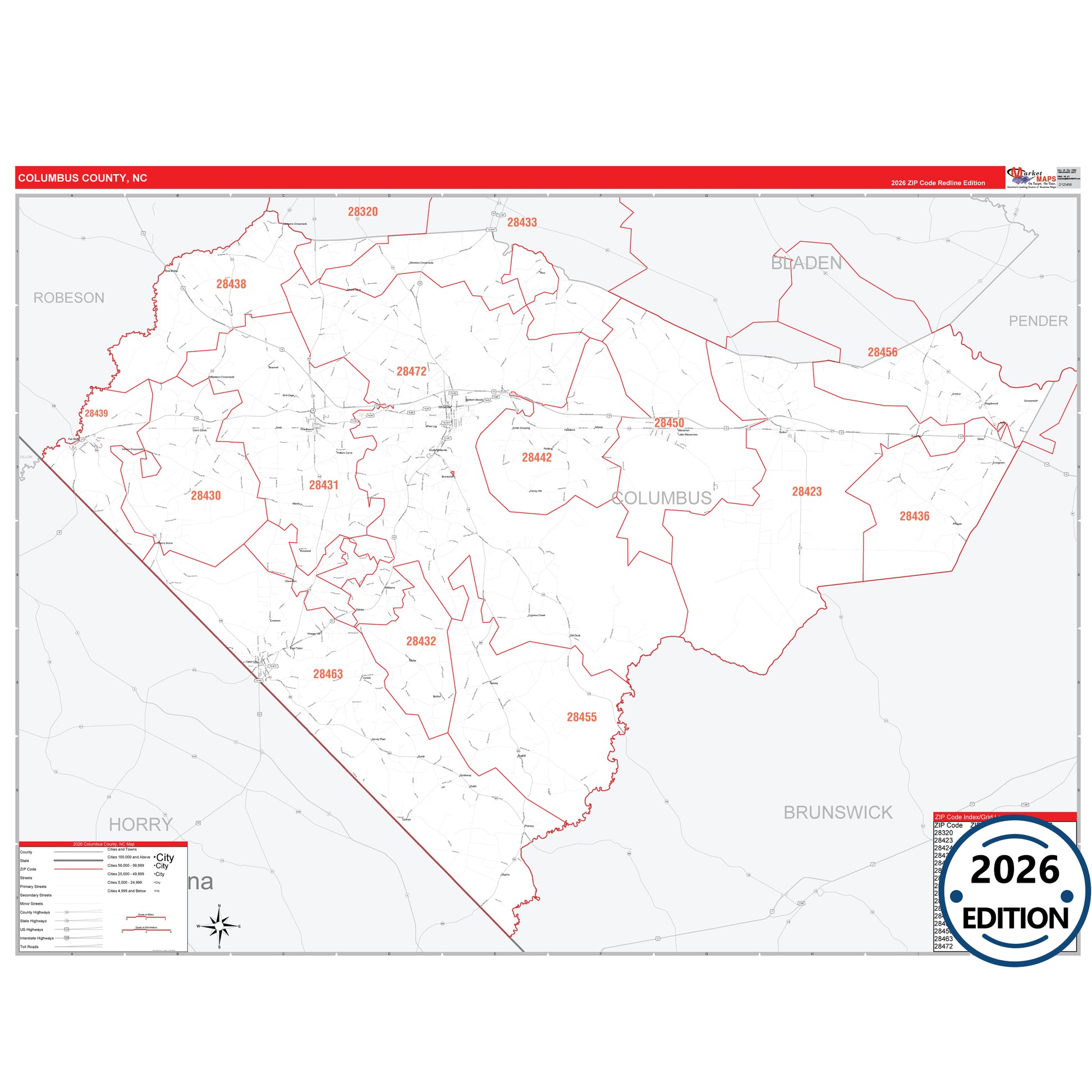 The RedLine Style map of Columbus County, NC shows ZIP code areas overlaid on a detailed road network of Columbus County, North Carolina. Ideal for drawing locations, territories, and other applications. Base map features include all major streets and highways labeled, cities and towns, county and state boundaries, neighborhood names, railroads, and a clean white background suitable for marking and planning.