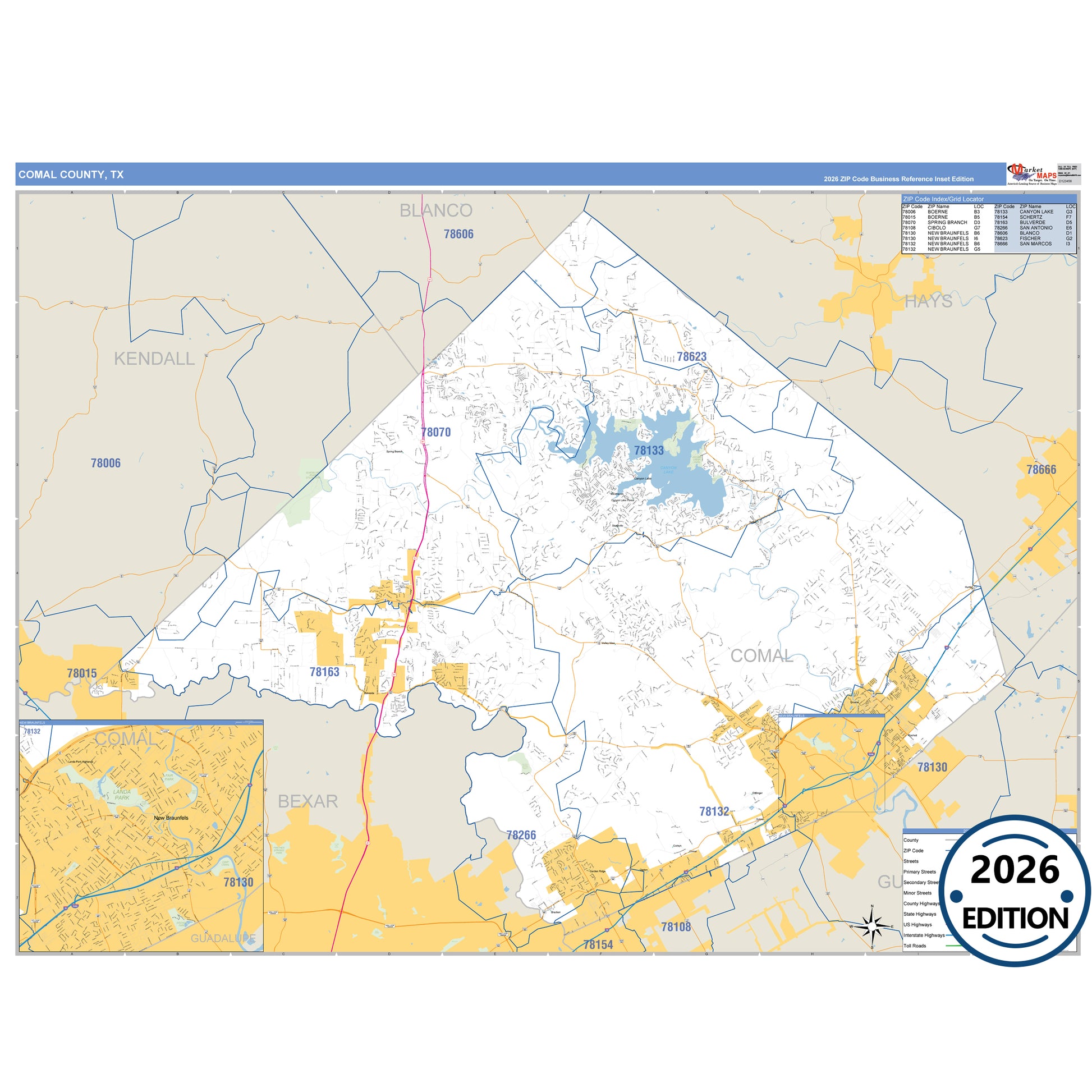 The Business Reference Style Comal County, TX is a detailed map that includes all towns, cities, major roadways, and highways. Available in multiple wall map sizes, perfect for home, school, office, or business display.