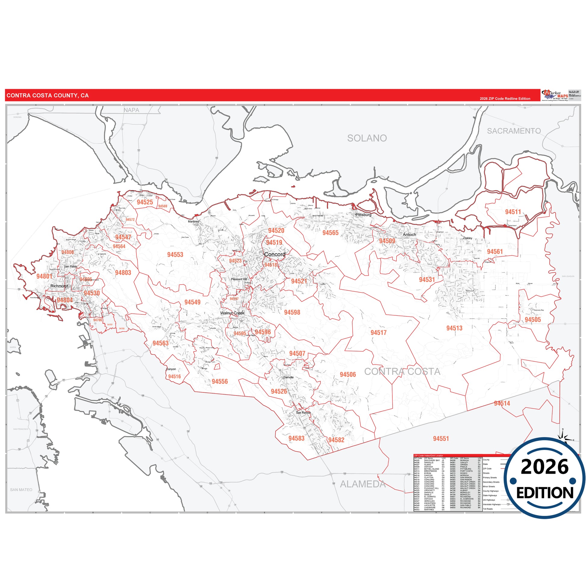 The RedLine Style map of Contra Costa County, CA shows ZIP code areas overlaid on a detailed road network of Contra Costa County, California. Ideal for drawing locations, territories, and other applications. Base map features include all major streets and highways labeled, cities and towns, county and state boundaries, neighborhood names, railroads, and a clean white background suitable for marking and planning.