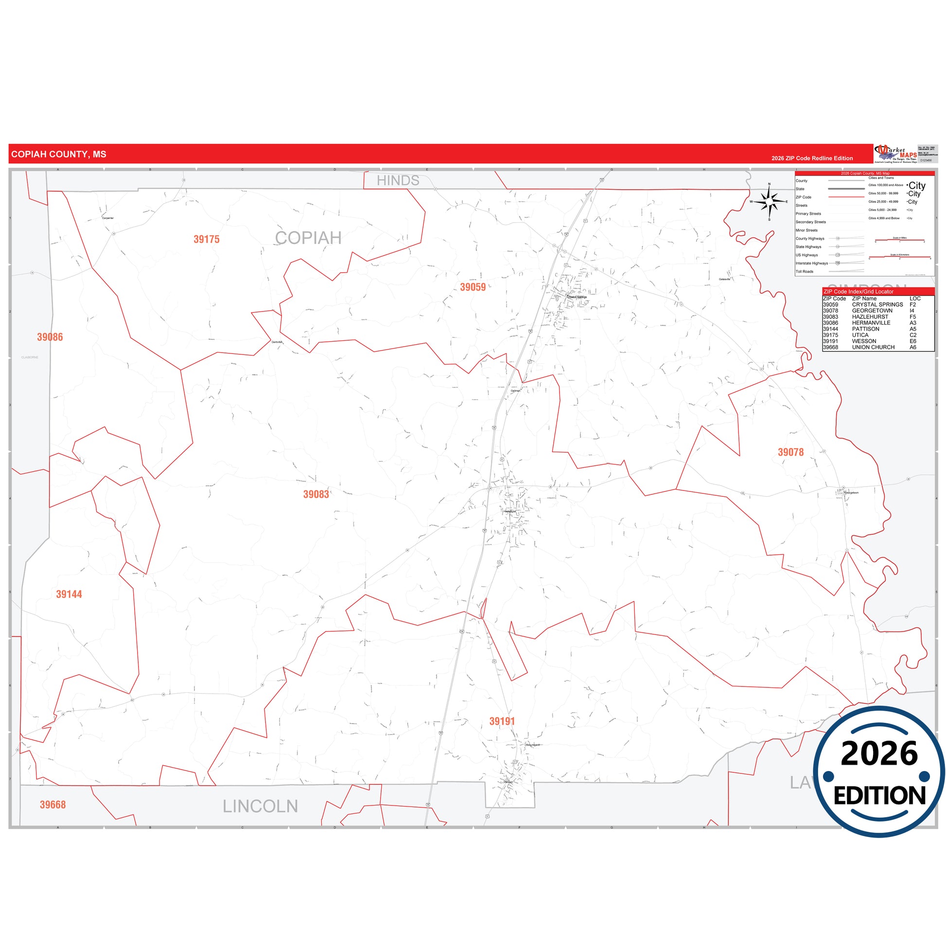 The RedLine Style map of Copiah County, MS shows ZIP code areas overlaid on a detailed road network of Copiah County, Mississippi. Ideal for drawing locations, territories, and other applications. Base map features include all major streets and highways labeled, cities and towns, county and state boundaries, neighborhood names, railroads, and a clean white background suitable for marking and planning.