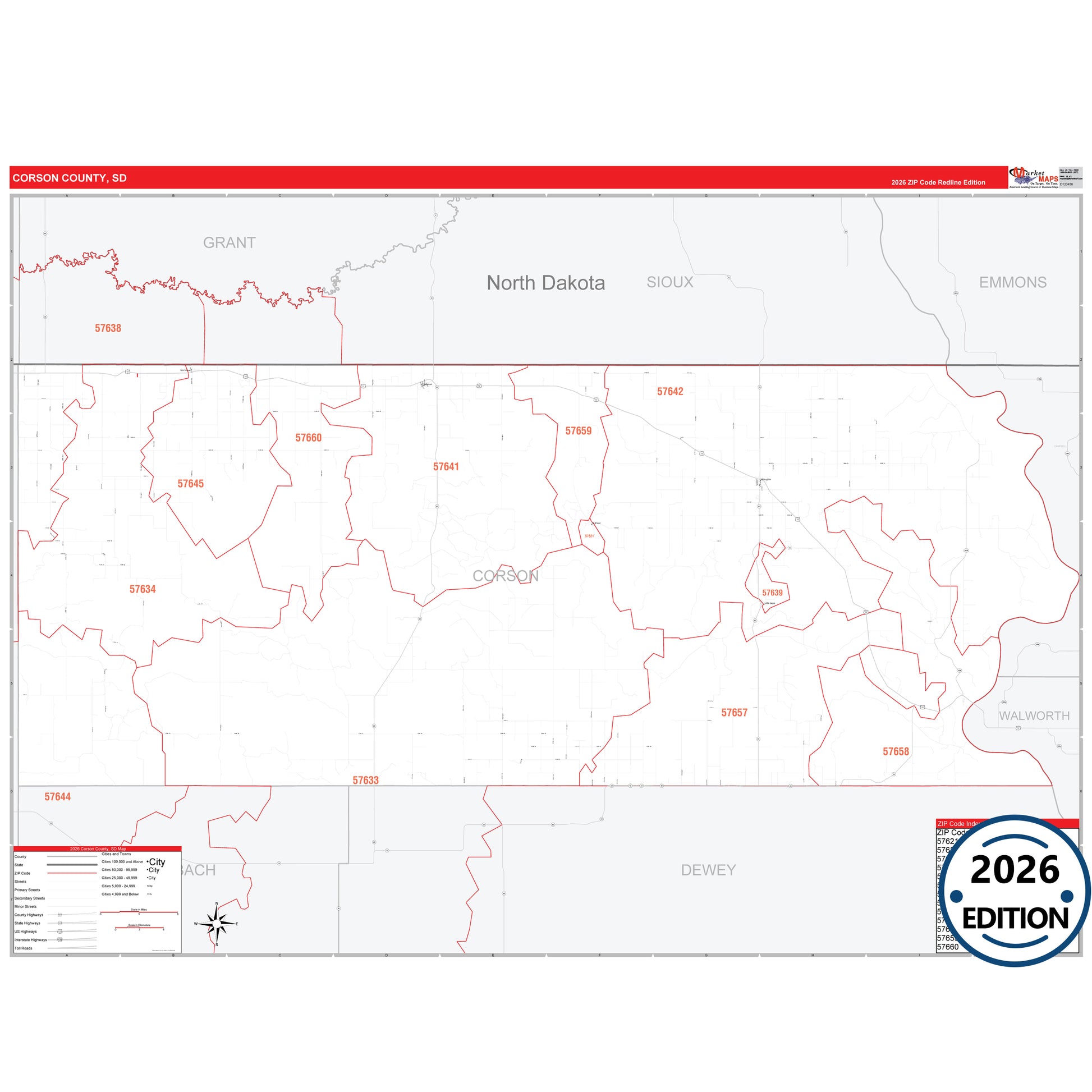 The RedLine Style map of Corson County, SD shows ZIP code areas overlaid on a detailed road network of Corson County, South Dakota. Ideal for drawing locations, territories, and other applications. Base map features include all major streets and highways labeled, cities and towns, county and state boundaries, neighborhood names, railroads, and a clean white background suitable for marking and planning.