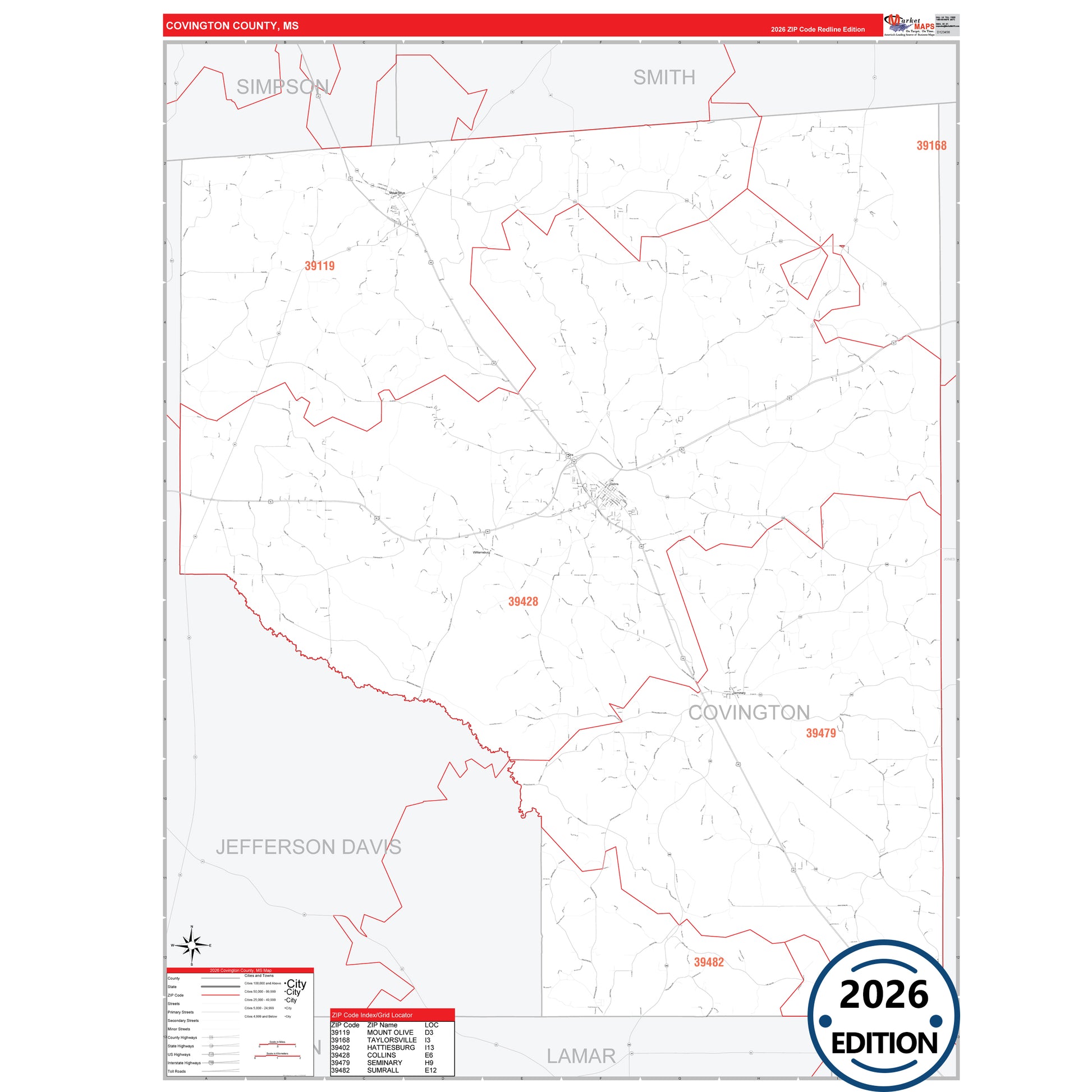 The RedLine Style map of Covington County, MS shows ZIP code areas overlaid on a detailed road network of Covington County, Mississippi. Ideal for drawing locations, territories, and other applications. Base map features include all major streets and highways labeled, cities and towns, county and state boundaries, neighborhood names, railroads, and a clean white background suitable for marking and planning.