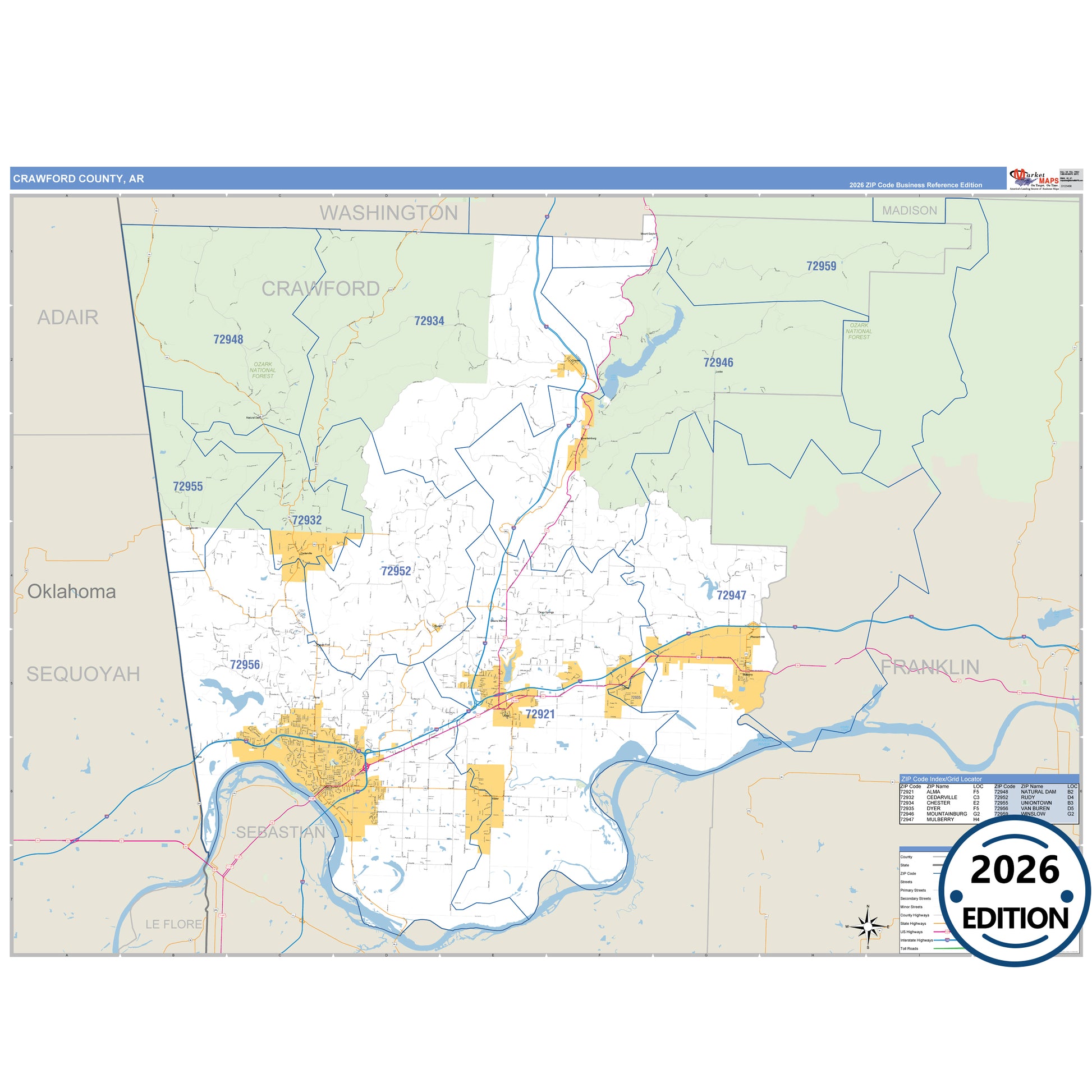 The Business Reference Style Crawford County, AR is a detailed map that includes all towns, cities, major roadways, and highways. Available in multiple wall map sizes, perfect for home, school, office, or business display.