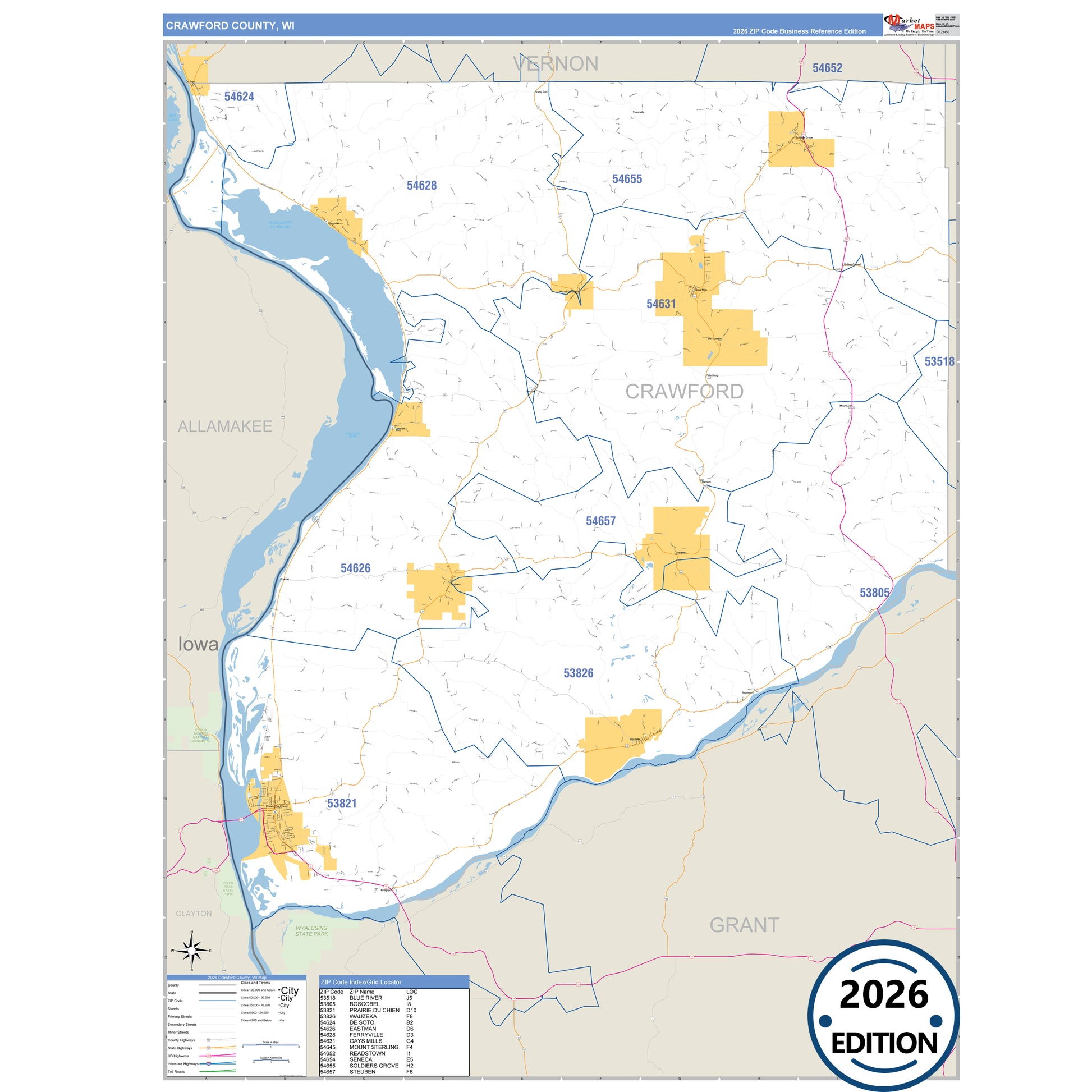 The Business Reference Style Crawford County, WI is a detailed map that includes all towns, cities, major roadways, and highways. Available in multiple wall map sizes, perfect for home, school, office, or business display.