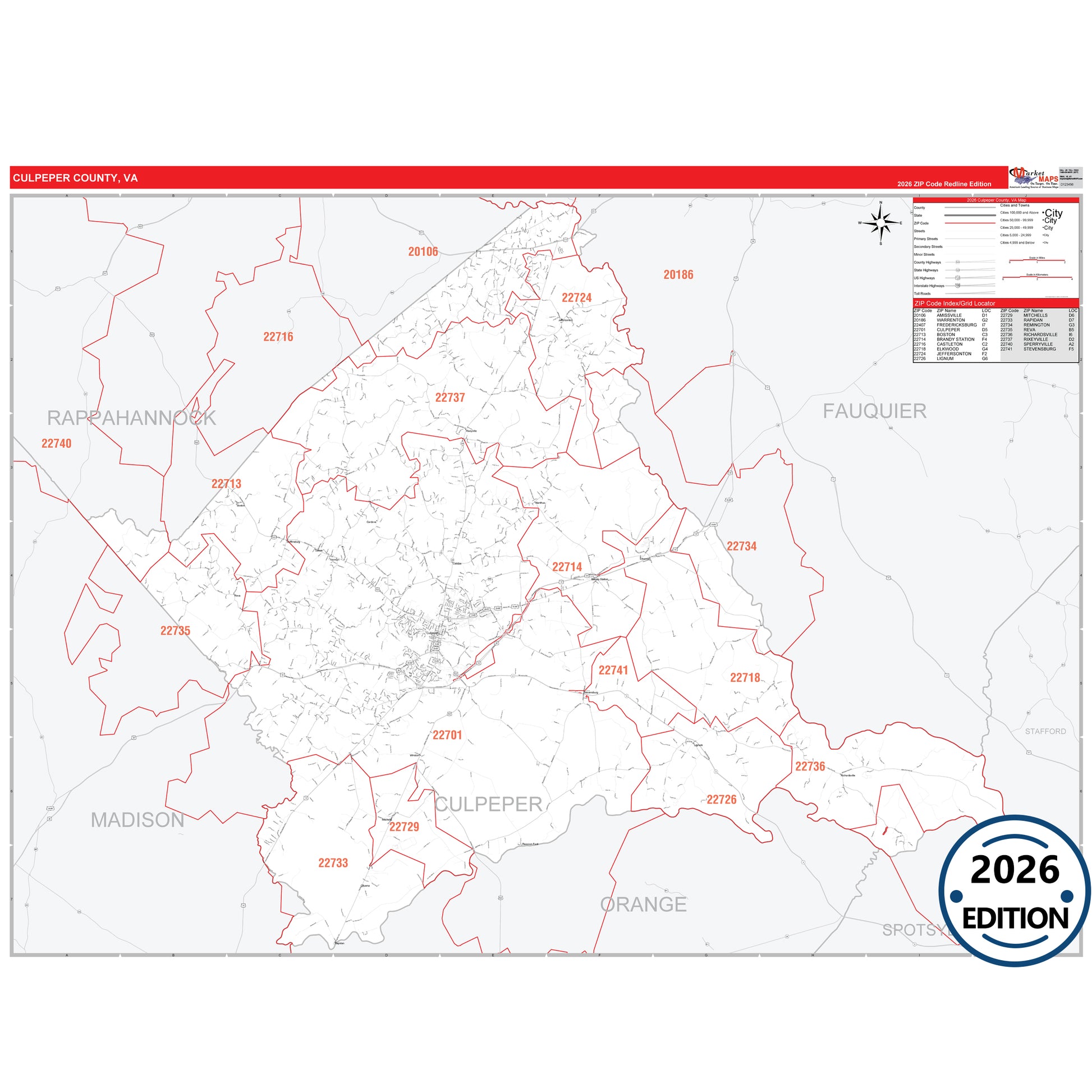 The RedLine Style map of Culpeper County, VA shows ZIP code areas overlaid on a detailed road network of Culpeper County, Virginia. Ideal for drawing locations, territories, and other applications. Base map features include all major streets and highways labeled, cities and towns, county and state boundaries, neighborhood names, railroads, and a clean white background suitable for marking and planning.